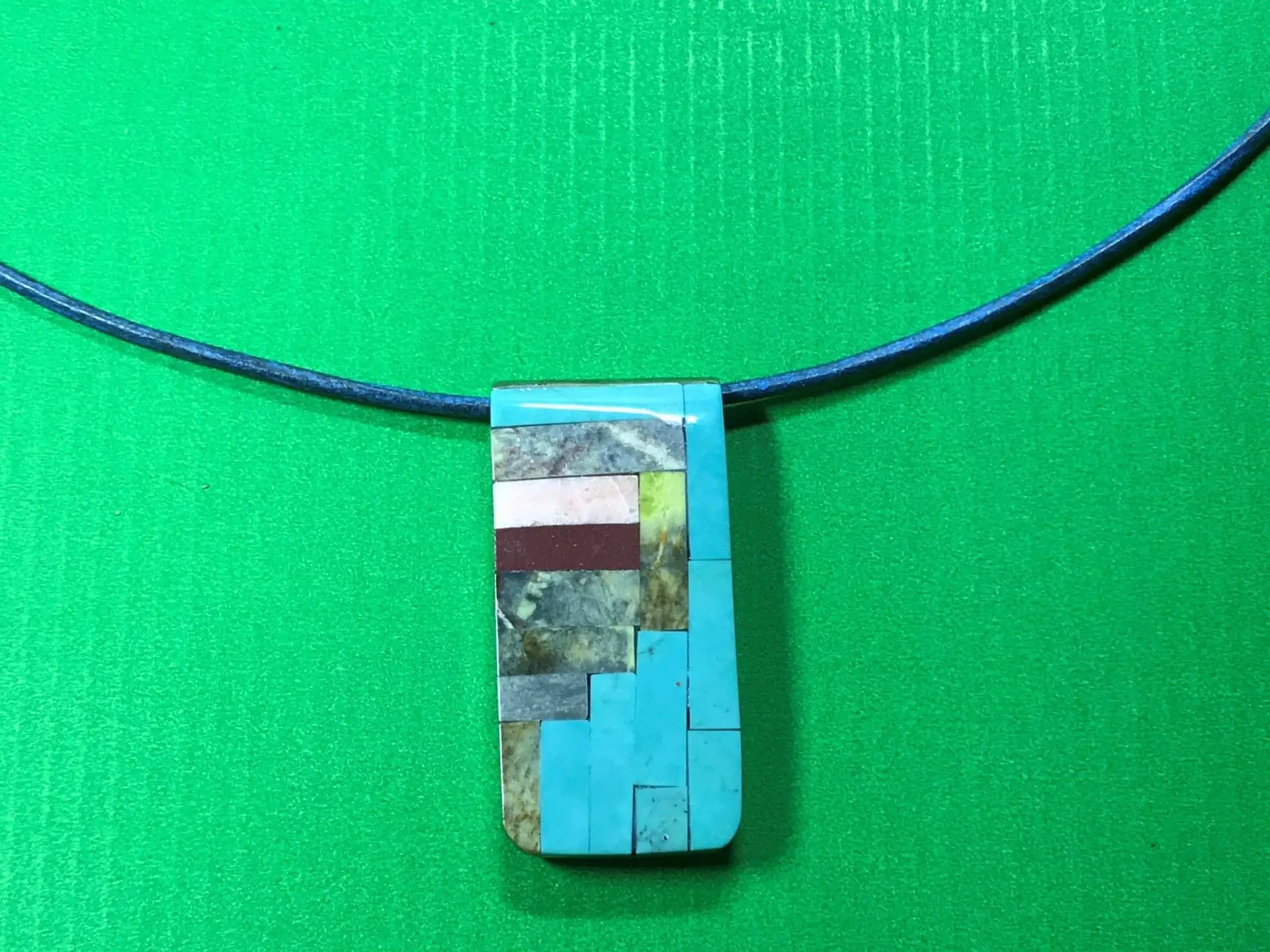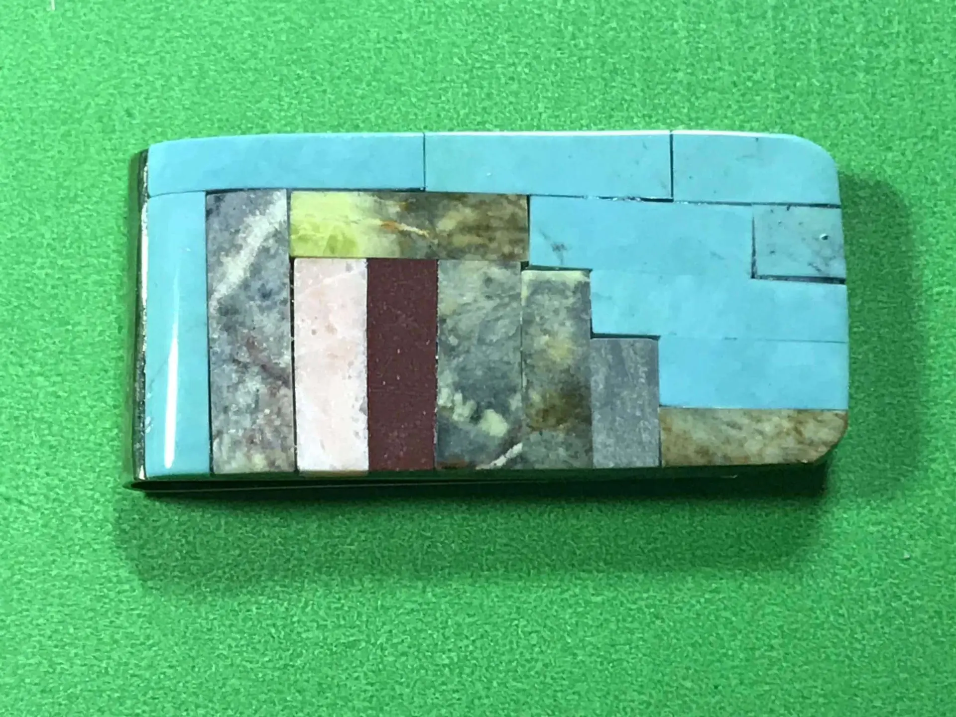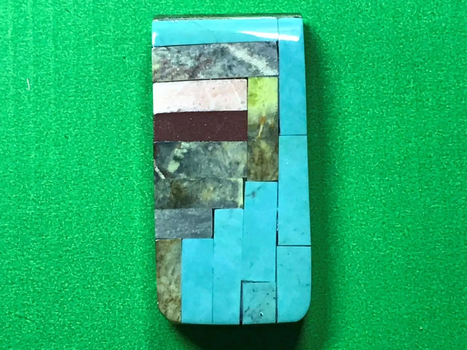 Diese vielseitige, handgefertigte Klammer von Paul Coriz, einem Künstler der Kewa Pueblo, besteht aus feinstem Sterlingsilber und ist kunstvoll mit einem Mosaik-Inlay aus Türkis, Charlene Reano Kewa Anhaenger Mit Tuerkis, Pipestone und Calcit verziert. Mit einer Länge von 5 cm und einer Breite von 2,6 cm kann diese Klammer entweder als stilvoller Anhänger an einem Lederband getragen oder funktional zum Zusammenhalten von Banknoten oder Zetteln verwendet werden.