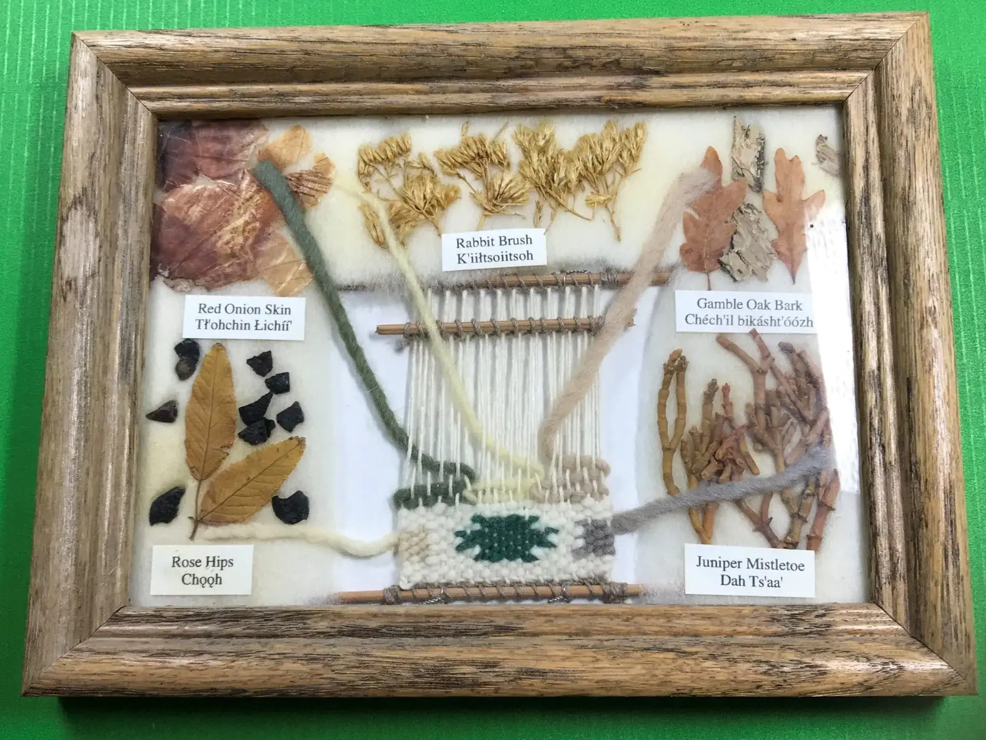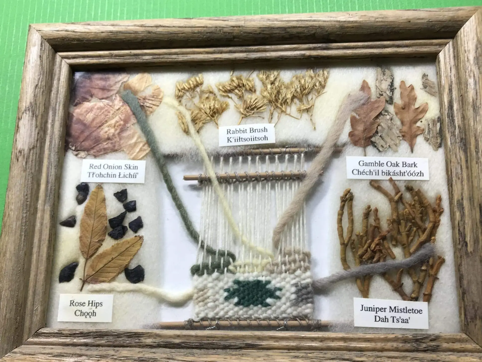Dieser Holzrahmen mit Glas enthält von einem Navajo zusammengestellte Pflanzenteile, die traditionell zum Färben von Wolle verwendet werden.