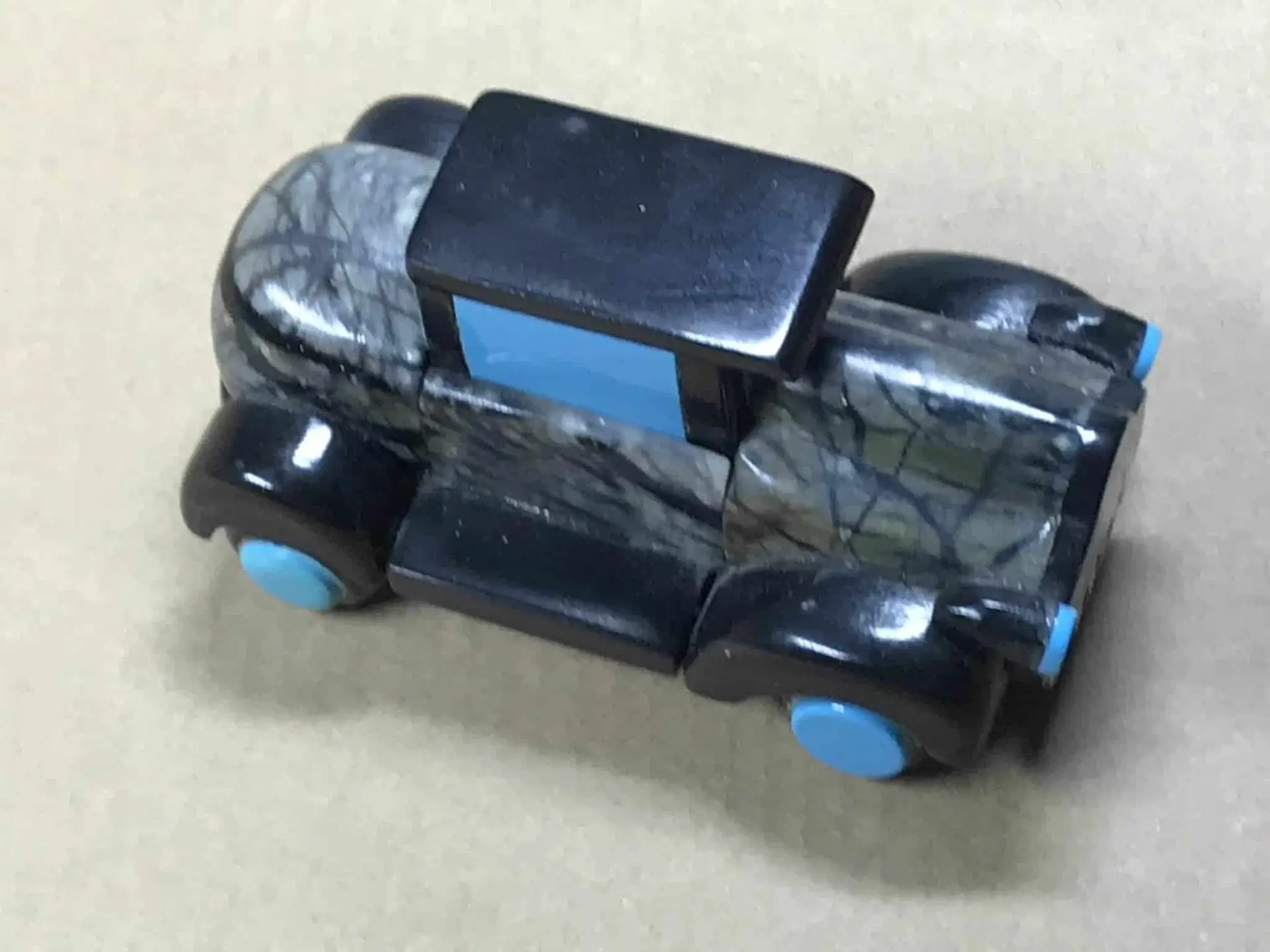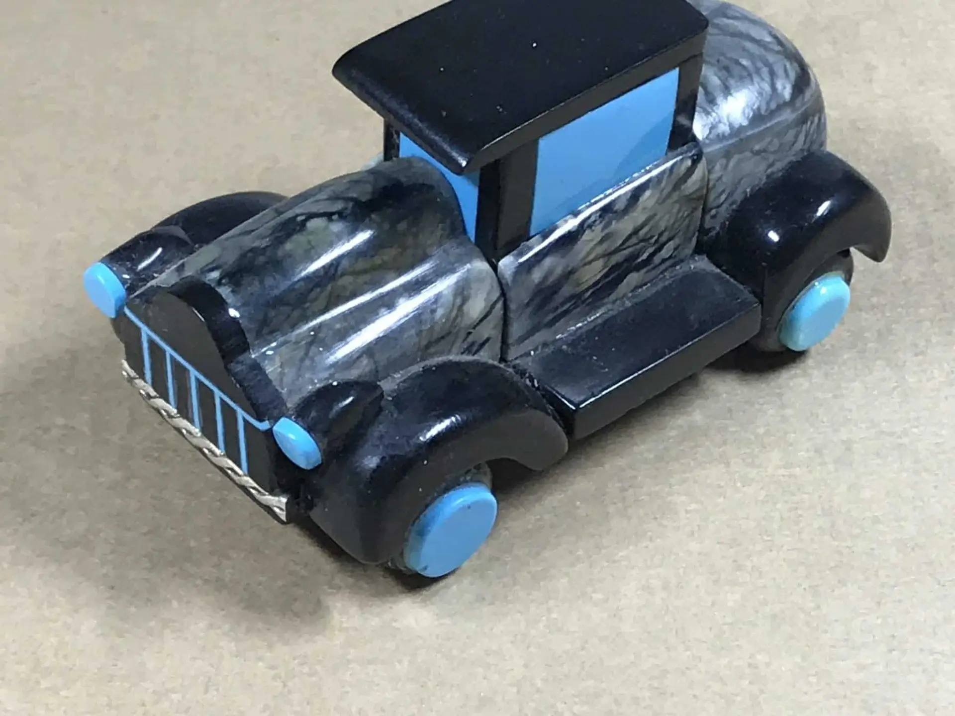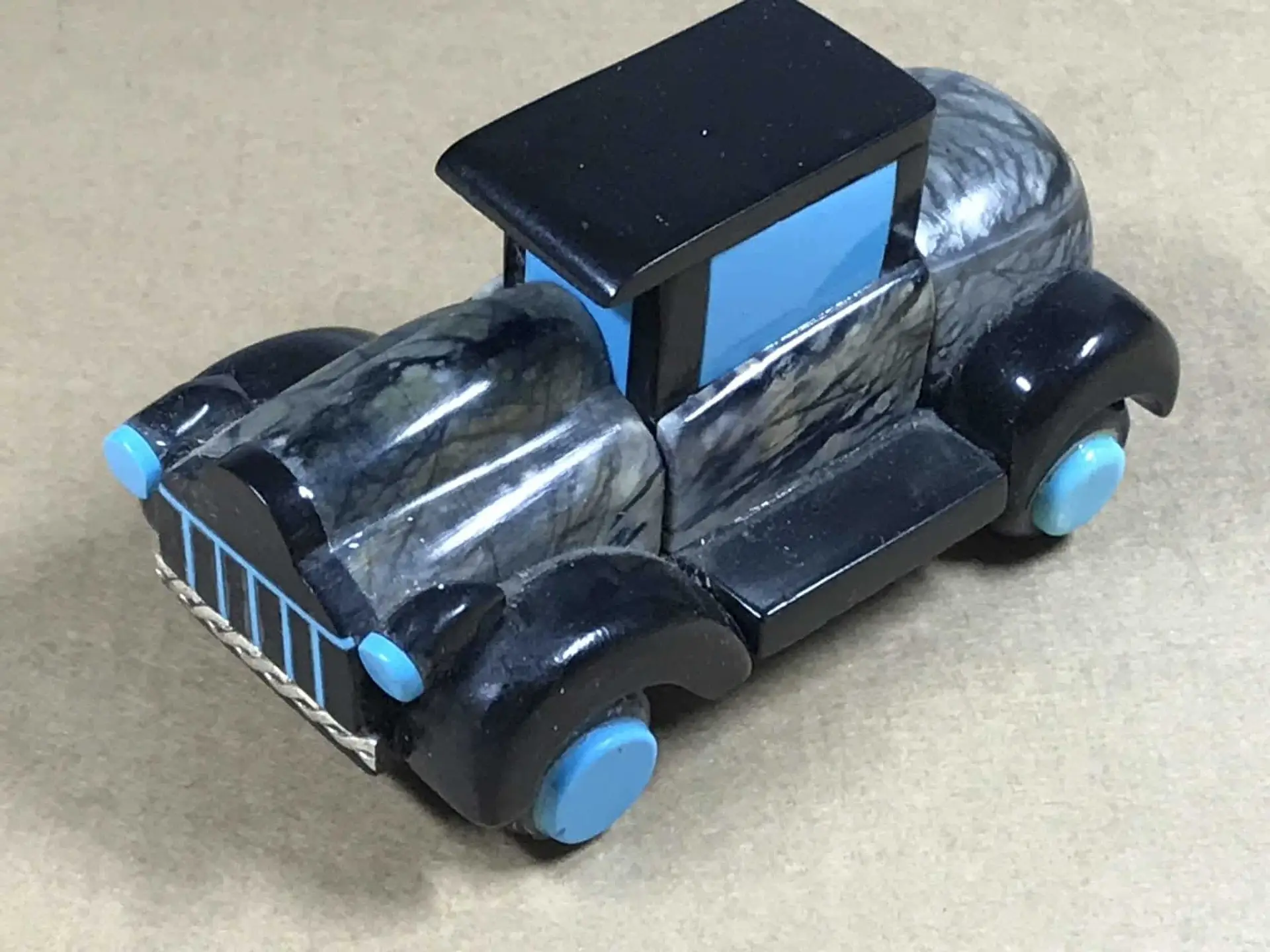 Auto in der Technik des stone carving der Zuni mit Mosaic Inlay aus Picasso Marble, Jet, Türkis und Sterlingsilber