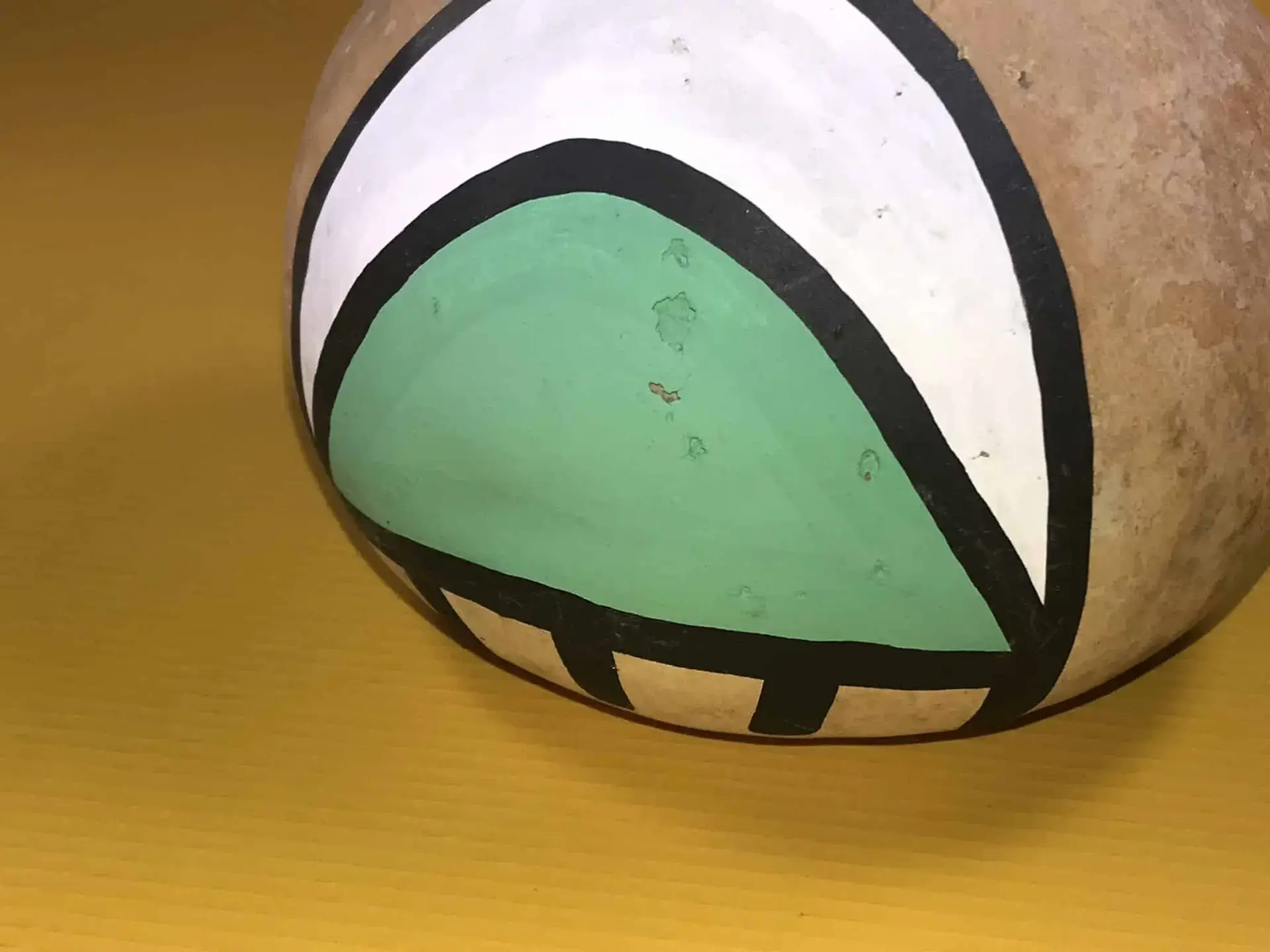 Schöpfkelle aus einem getrockneten Kürbis mit gemaltem Regenwolken-Design