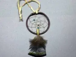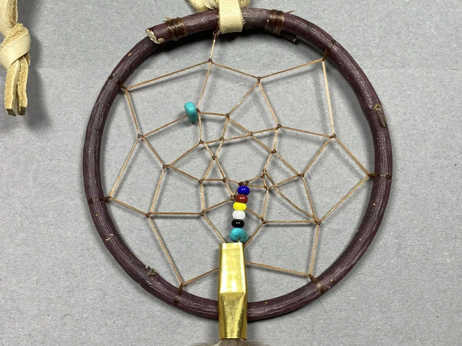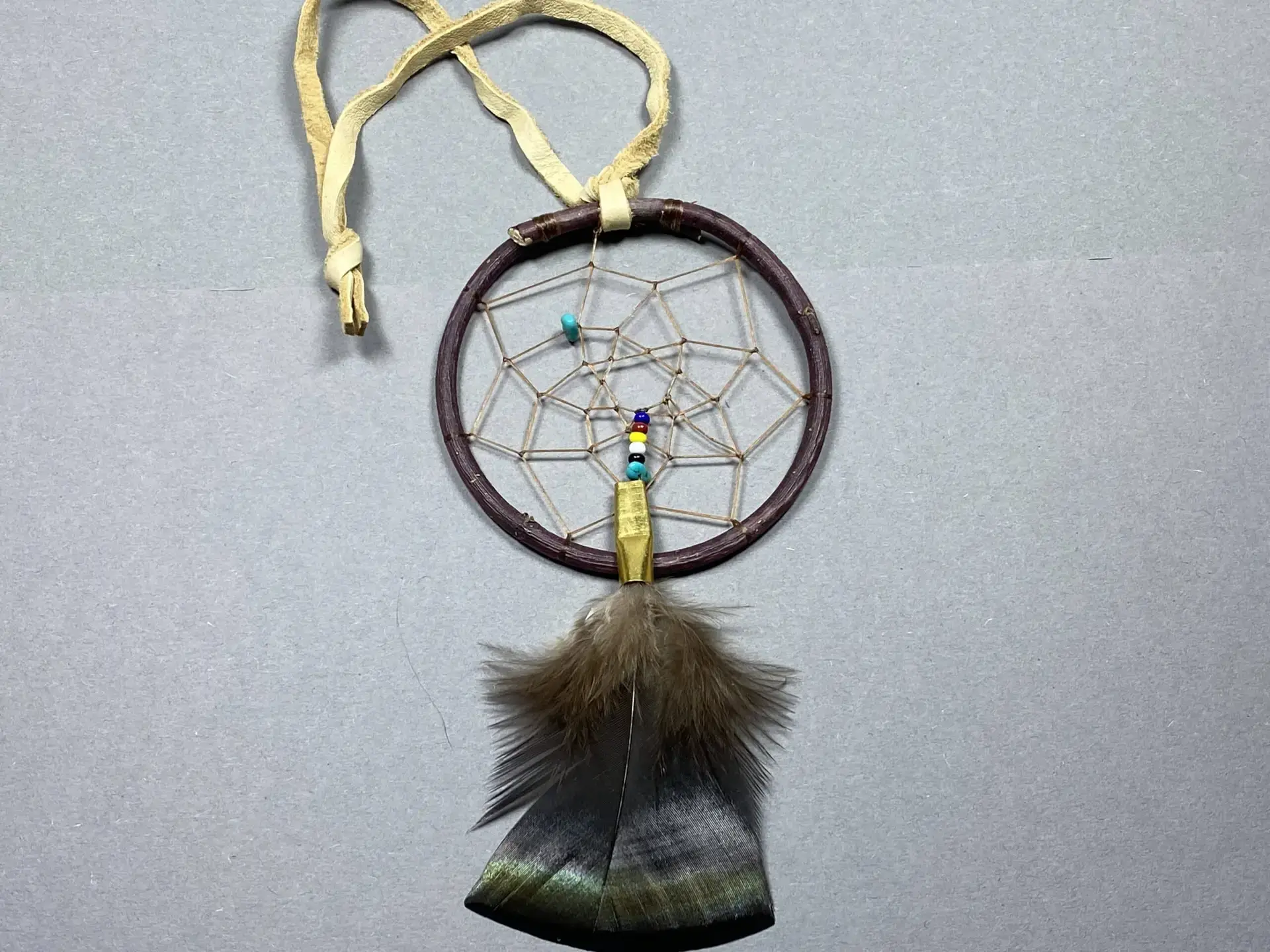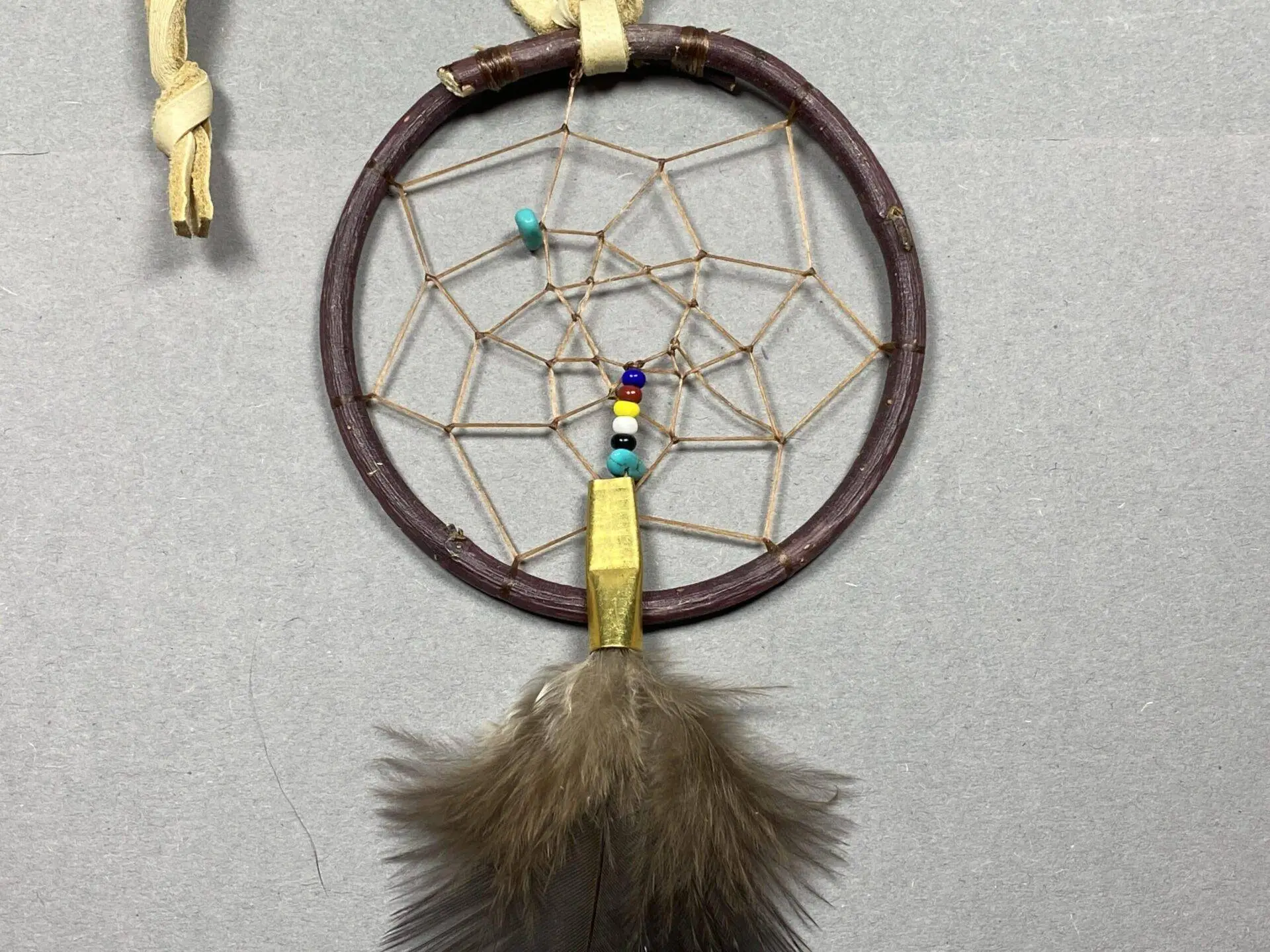 Kleiner Traumfänger aus Chokecherry-Holz mit brauner Feder eines wilden Truthahns an einer Befestigung mit Messingcone, Türkisnugget und Glasperlen.