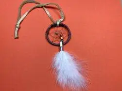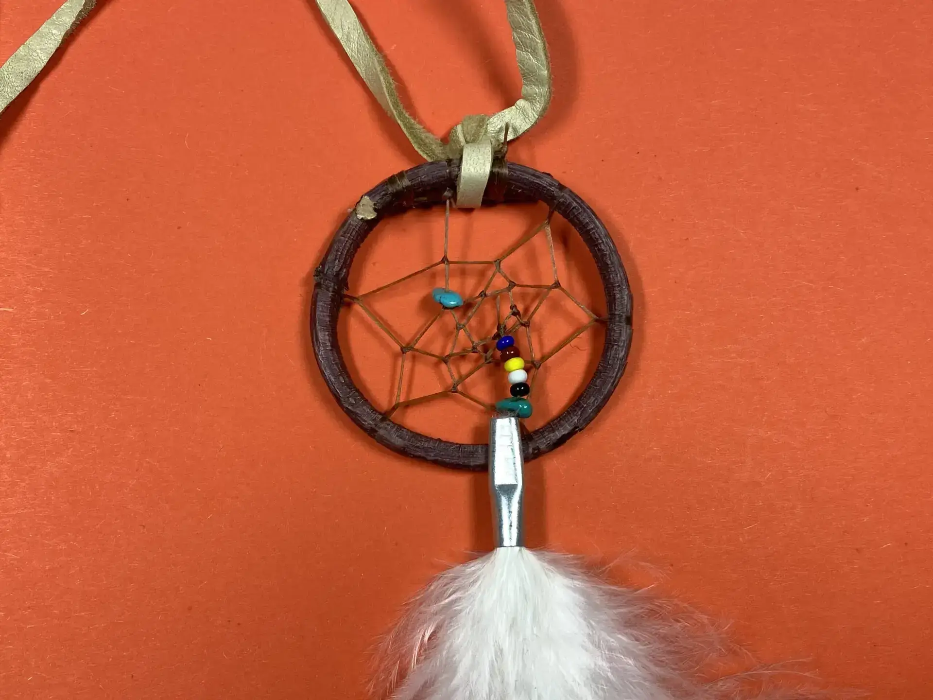 Mini-Traumfänger aus Chokecherry-Holz mit weisser Flaumfeder eines wilden Truthahns an Befestigung mit Türkisnugget und Glasperle