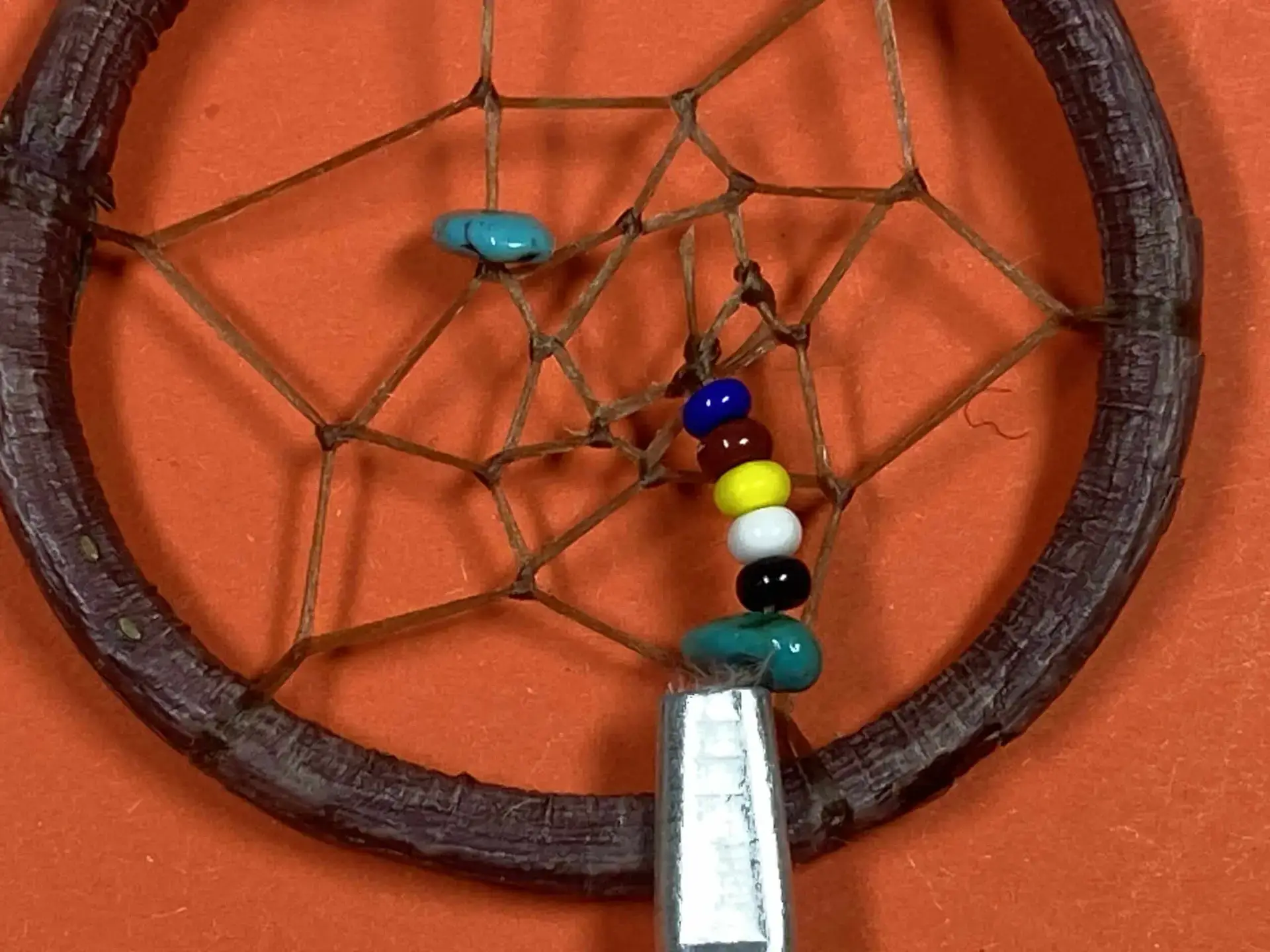 Dieser Mini-Traumfänger von Amelia Cordell ist aus Chokecherry-Holz gefertigt und hat einen Durchmesser von 5 cm. An ihm hängt eine weiße Flaumfeder eines wilden Truthahns, befestigt mit einem Türkisnugget und Glasperlen. Das Netz ist aus Sehne gesponnen und enthält einen weiteren kleinen Türkisnugget im Zentrum.