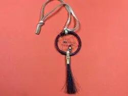 Dieser kleine, sorgfältig gearbeitete Traumfänger verbindet traditionelle Materialien und die handwerkliche Kunst der Dakota-Kultur auf harmonische Weise.