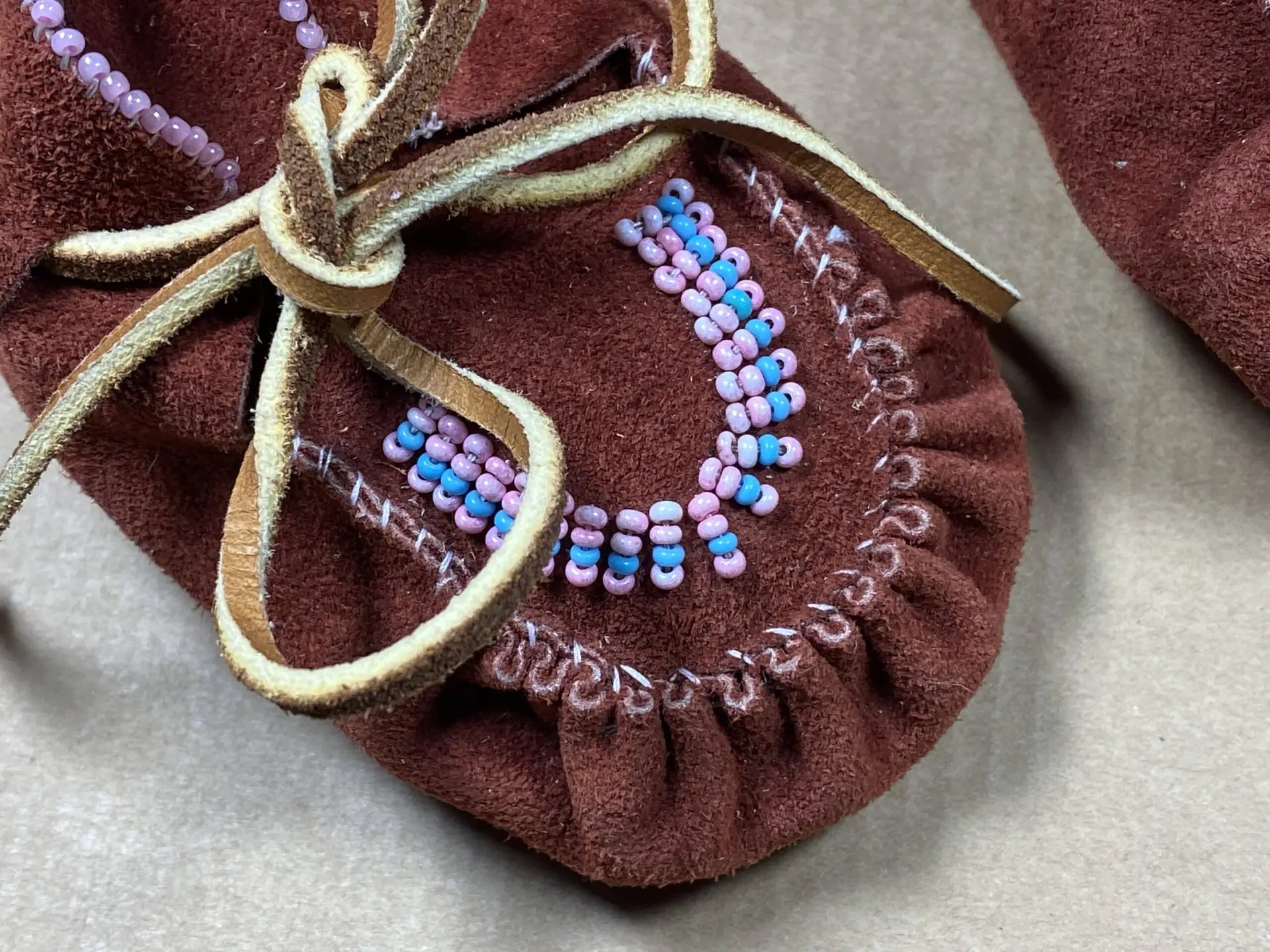 Diese handgefertigten Babymoccasins von Arnalda Chee bestehen aus weichem Wildleder und sind mit einer feinen Glasperlenstickerei (Beadwork) verziert.