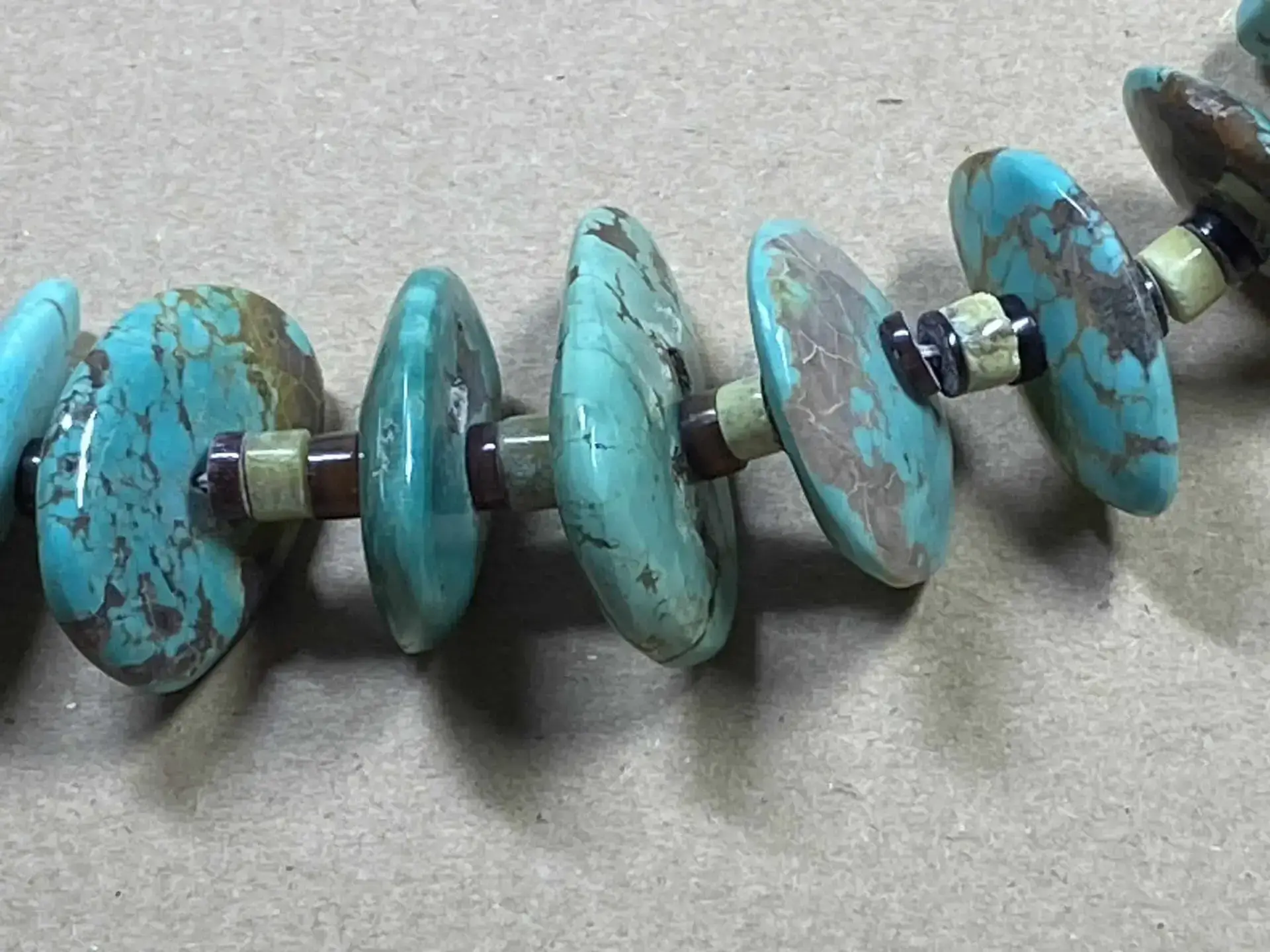 Die Kette hat eine Länge von 59 cm und besticht durch ihre beeindruckende Materialvielfalt. Die Türkissteine haben eine Länge von 17 bis 36 mm, während die Serpentin- und Jet-Perlen einen Durchmesser von 5 bis 7 mm aufweisen.