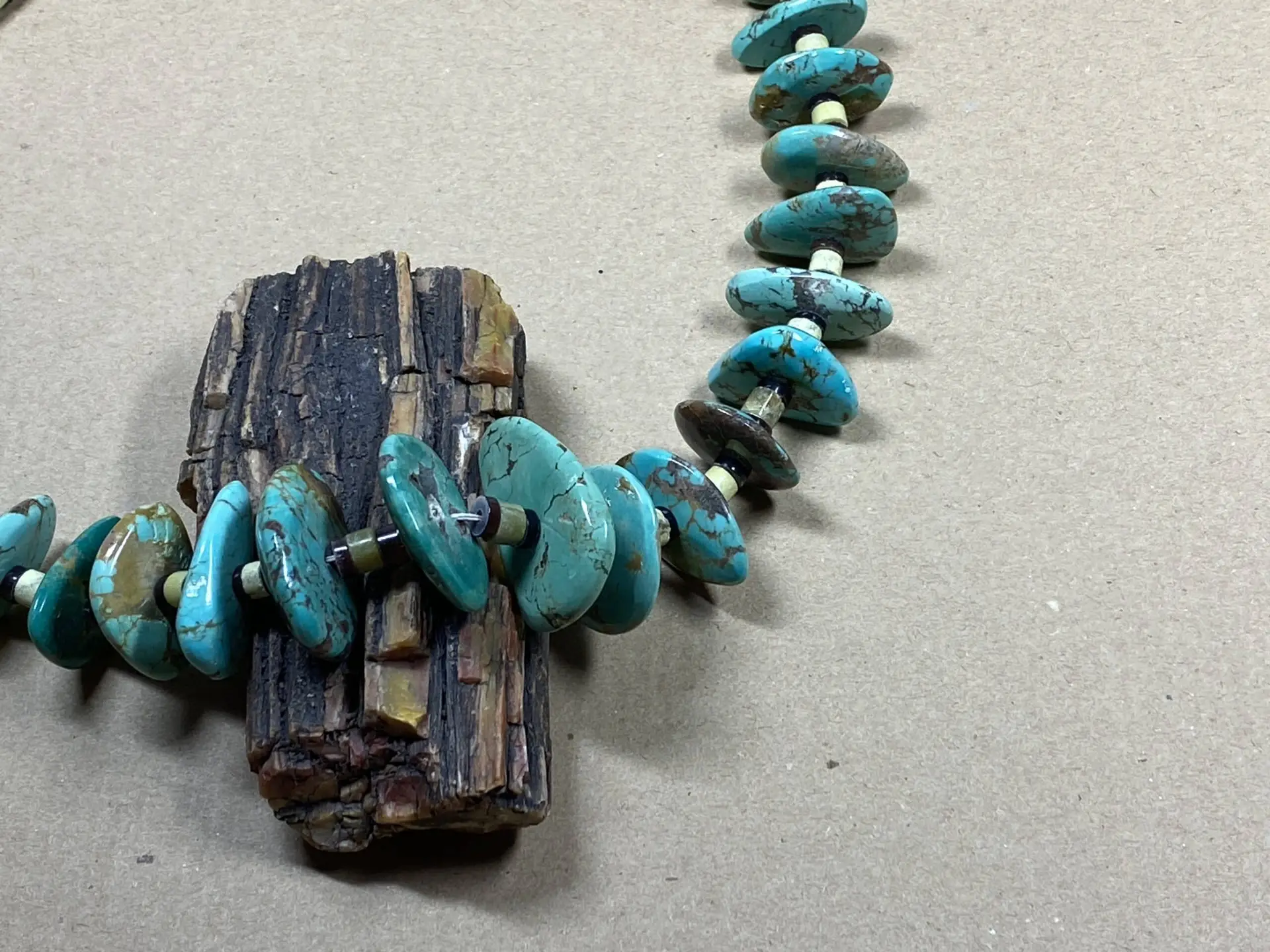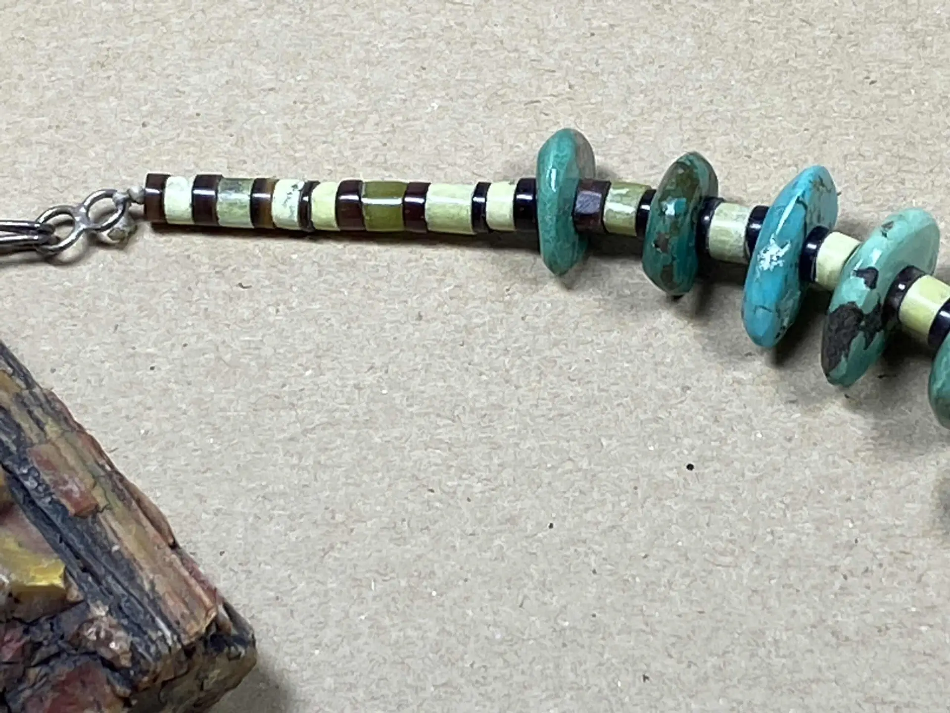 Diese schwere Türkishalskette von Augustine Lovato kombiniert handgeschliffene Steine aus Türkis, gelbem und grünem Serpentine sowie Jet (versteinerte Kohle).