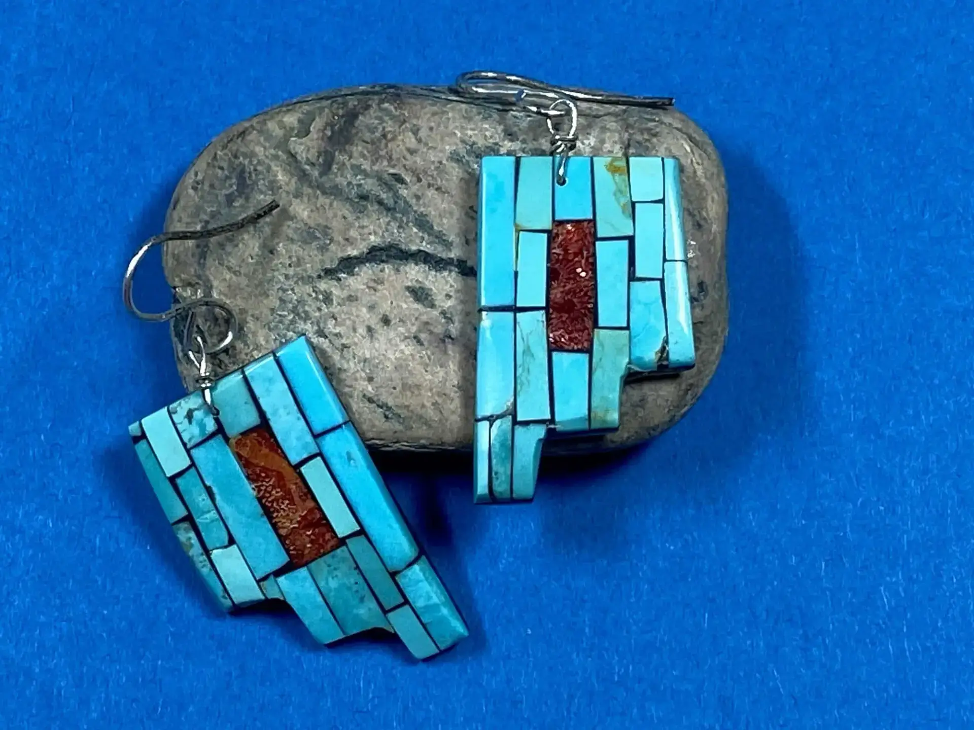 Diese Ohrhänger von Charlotte & Percy Reano zeigen ein kunstvolles Mosaic Inlay aus Türkis und Koralle, das auf einer Basis aus Perlmutt angebracht ist. Das Design ist von den Stufen einer Kiva inspiriert, was dem Schmuckstück eine besondere symbolische Tiefe verleiht.