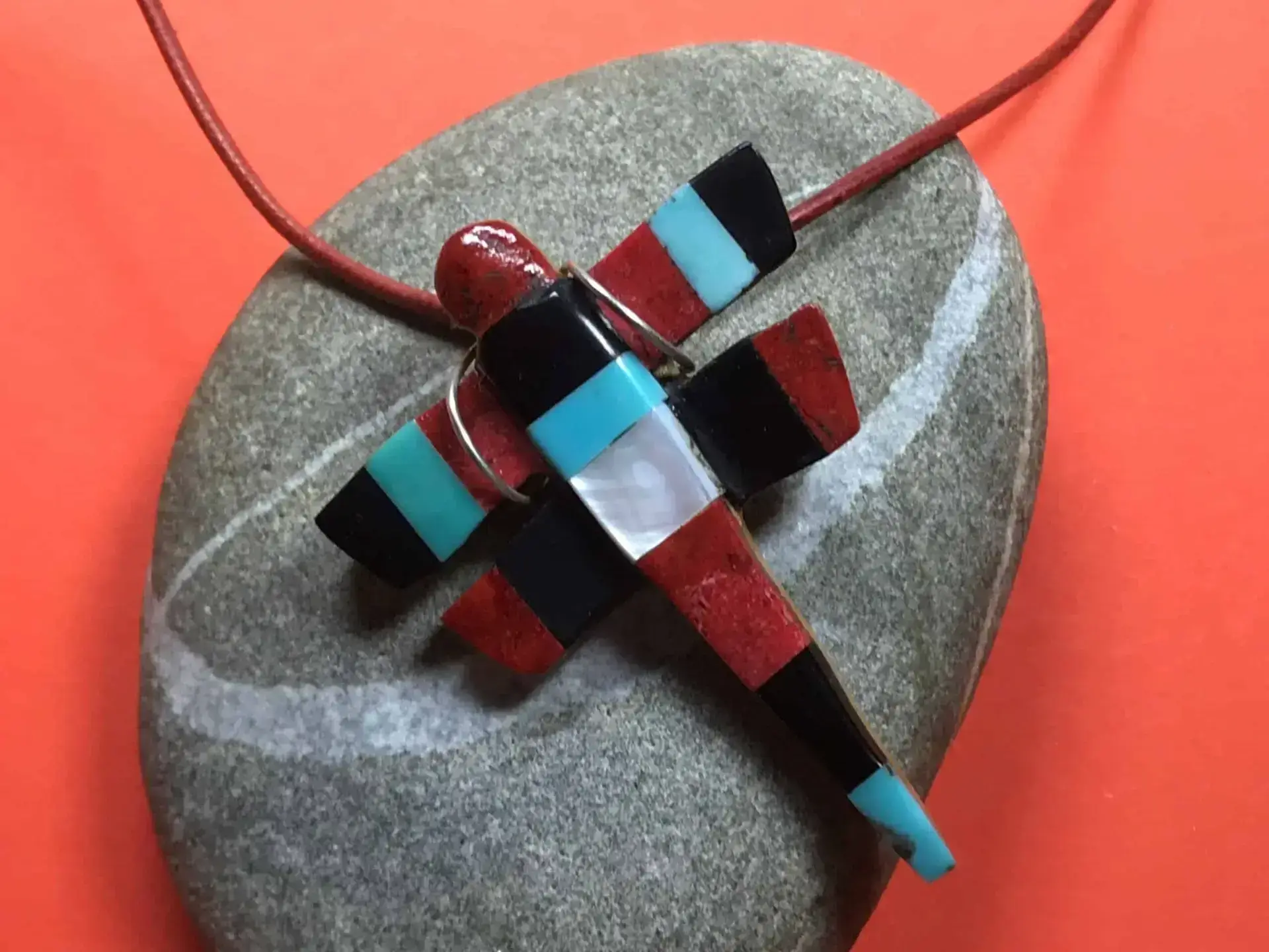 Dieser kunstvolle Libellen-Anhänger von Cheryl Beyuka, einer angesehenen Künstlerin der Zuni, besteht aus edlem Travertin und ist mit einem filigranen Inlay aus Koralle, Türkis und Perlmutt verziert. Der Anhänger hat eine Länge von 6 cm und stellt die symbolische Bedeutung der Libelle in der Zuni-Kultur auf wunderschöne Weise dar.