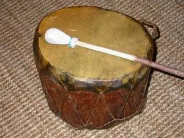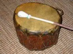 Diese traditionelle, doppelseitig bespannte Trommel besteht aus einem ovalen Körper aus Zitterpappelholz, der noch von der Rinde umgeben ist, und einem Trommelfell aus Pferdeleder.