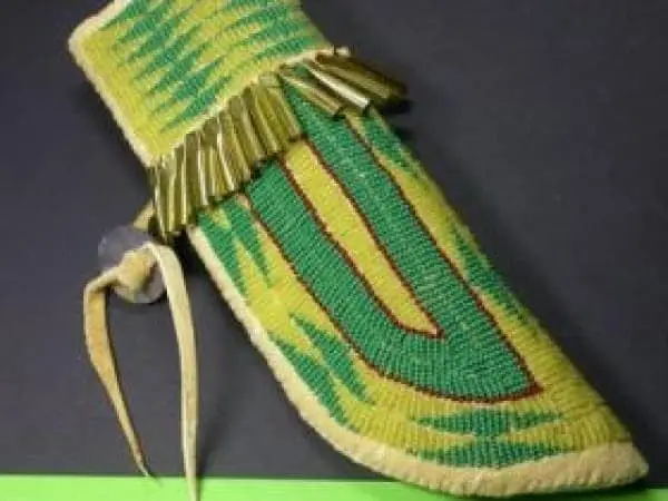 Die Messerscheide von Diana Passmore, einer Künstlerin der Blackfeet, besteht aus traditionell mit Büffelhirn gegerbtem Hirschleder. Die Scheide ist mit Beadwork aus überwiegend grünen Glasperlen verziert und spiegelt die handwerkliche Präzision und künstlerische Tradition der Blackfeet wider. Zusätzlich ist die Messerscheide mit Abalone-Muscheln und Messingelementen versehen, die dem Stück eine besondere ästhetische Tiefe verleihen. Die Länge der Messerscheide beträgt 23 cm.