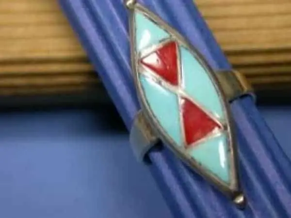 Dieser kunstvolle Channel Inlay Fingerring von Eugene Mahooty, einem geschätzten Zuni-Künstler, besteht aus feinstem Sterlingsilber und ist mit einem präzisen Inlay aus Türkis und Koralle verziert. Der Ring hat einen Innenumfang von 49 mm (Größe 5 in den USA) und eine Länge von 3,1 cm, was ihn zu einem markanten und dennoch eleganten Schmuckstück macht.