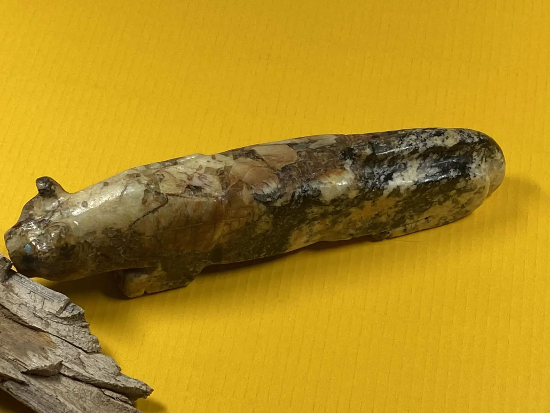 Dieser aus Picasso-Marmor geschnitzte Berglöwe von Sebastian Santos, einem Zuni-Künstler, ist ein kraftvolles Symbol für Mut, Wachsamkeit und Schutz. In der Zuni-Kultur gilt der Berglöwe als Beschützer der Familie und als Begleiter auf schwierigen Wegen. Picasso-Marmor, bekannt für seine einzigartigen grauen und schwarzen Maserungen, verleiht dem Berglöwen eine lebendige, fast dynamische Textur, die die kraftvolle Präsenz des Tieres unterstreicht.