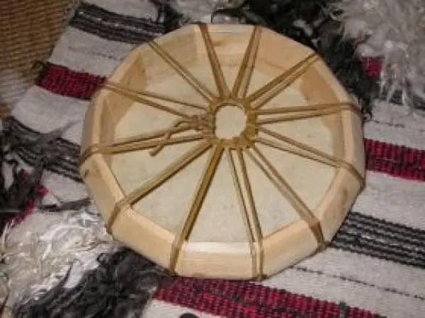 Cochiti Handtrommel aus Zitterpappelholz, Pferdehaut und -sehnen