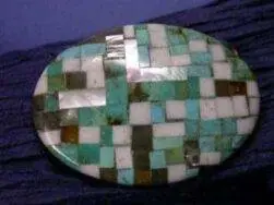 Gürtelschnalle aus Türkis, Perlmutt, Serpentine und Alabaster auf Metall. Eignet sich für Gürtel mit einer maximalen Breite von 2.8 cm