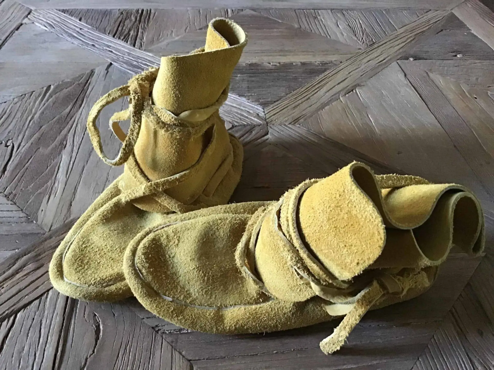 Die Farbe variiert leicht – von hellem Braun bis zu einem warmen Gelbton –, da das Leder nicht gefärbt, sondern in seiner natürlichen Beschaffenheit belassen wird. Jedes Paar ist ein Unikat und zeugt vom traditionellen Handwerk nordamerikanischer Ureinwohner.