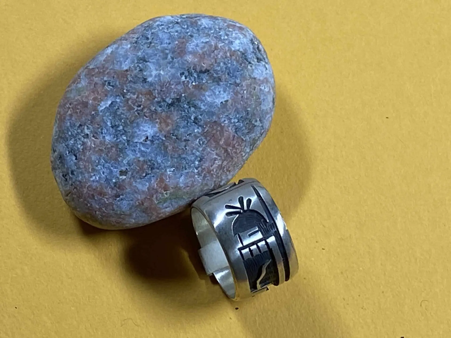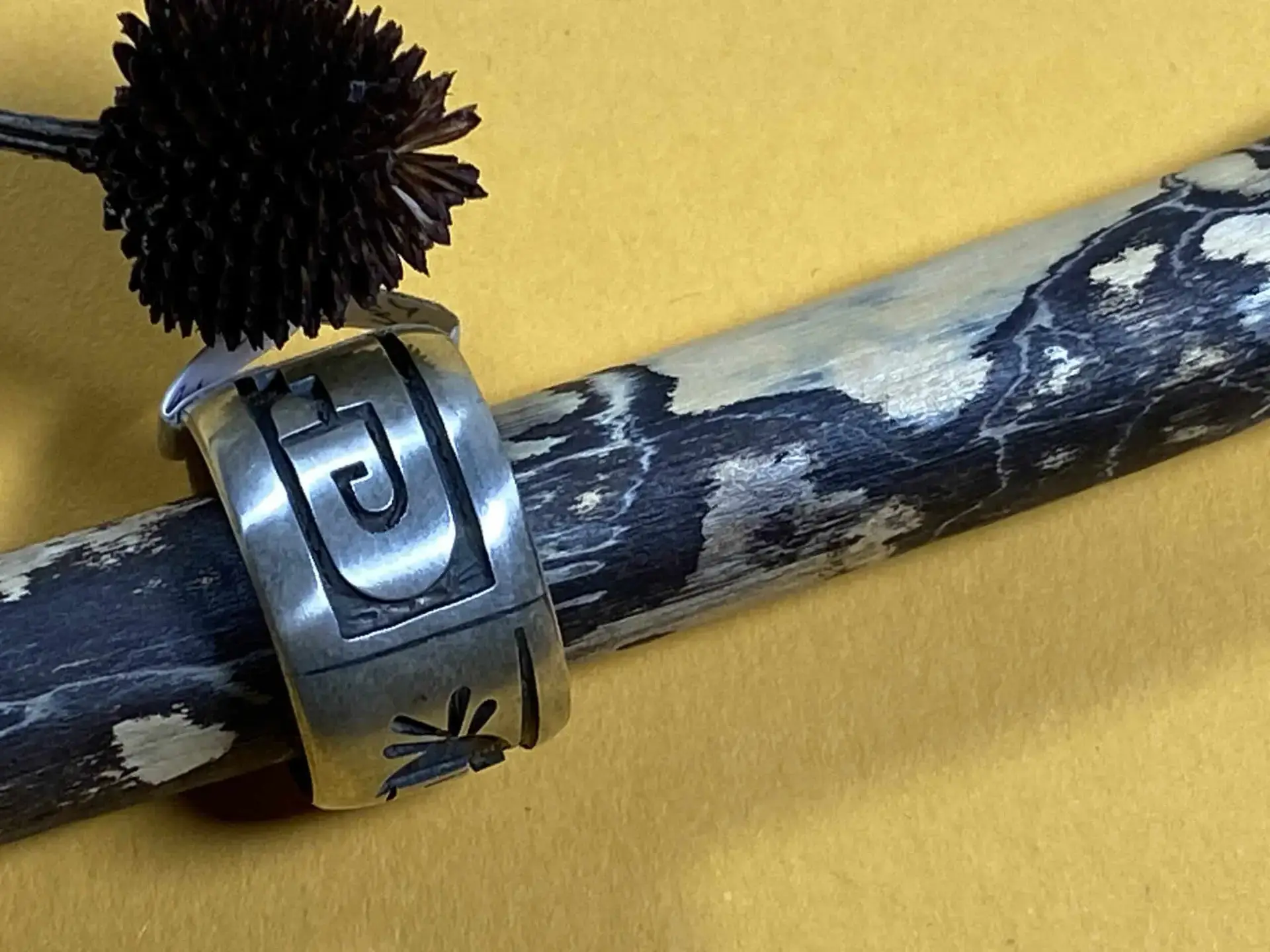Dieser eindrucksvolle Overlay-Fingerring von Ray Namingha, einem bekannten Künstler der Hopi, ist aus feinstem Sterlingsilber gefertigt und zeigt drei bedeutende Motive: die Longhair Kachina, Regenwolken und Wasserwellen. Mit einer Größe von 6 3/4, einem Innendurchmesser von 1,65 cm und einer Breite von 1,3 cm vereint dieser Ring traditionelle Symbole der Hopi-Kultur und die meisterhafte Overlay-Technik.