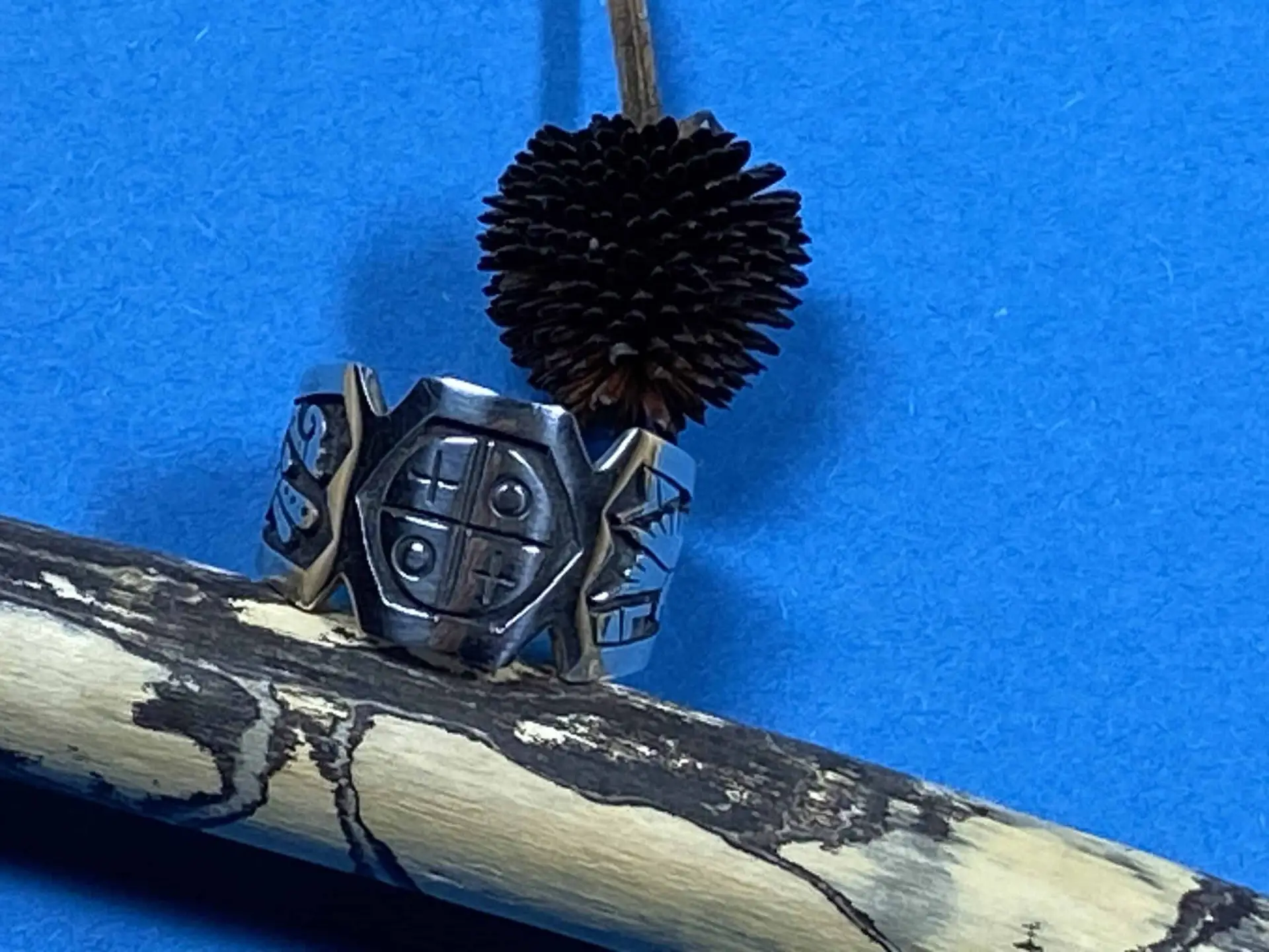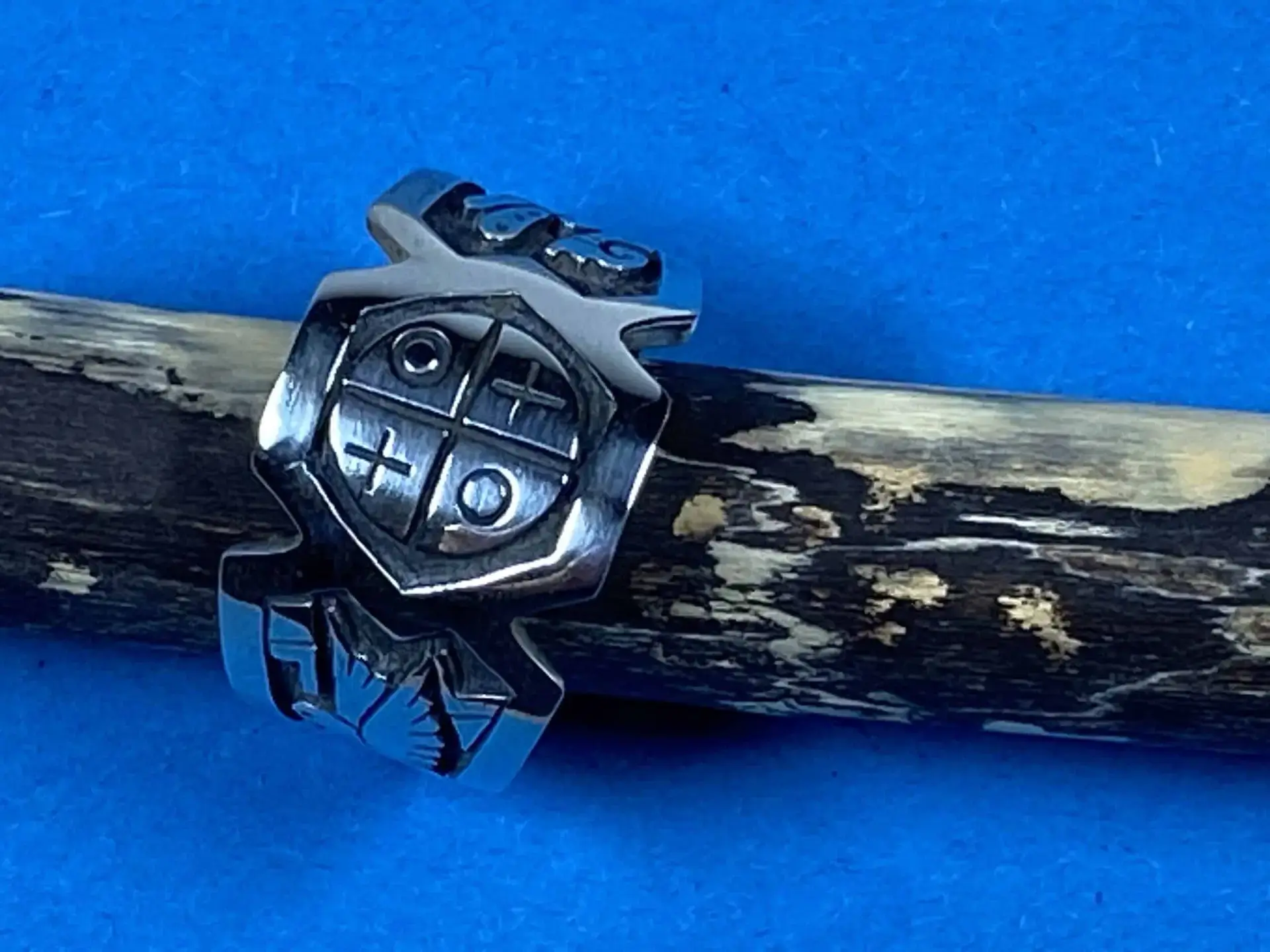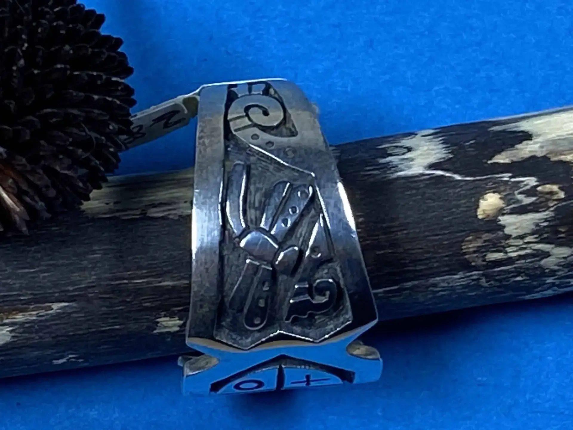 Dieser beeindruckende Overlay-Fingerring von Sparky Masawytewa, einem talentierten Hopi-Künstler, ist aus feinstem Sterlingsilber gefertigt und zeigt vier bedeutende Symbole: das Medizinrad, eine Libelle, einen Kolibri und Wasserwellen. Der Ring hat eine Größe von 7, einen Innendurchmesser von 1,8 cm und eine Breite, die von 0,5 cm bis 1,3 cm variiert.