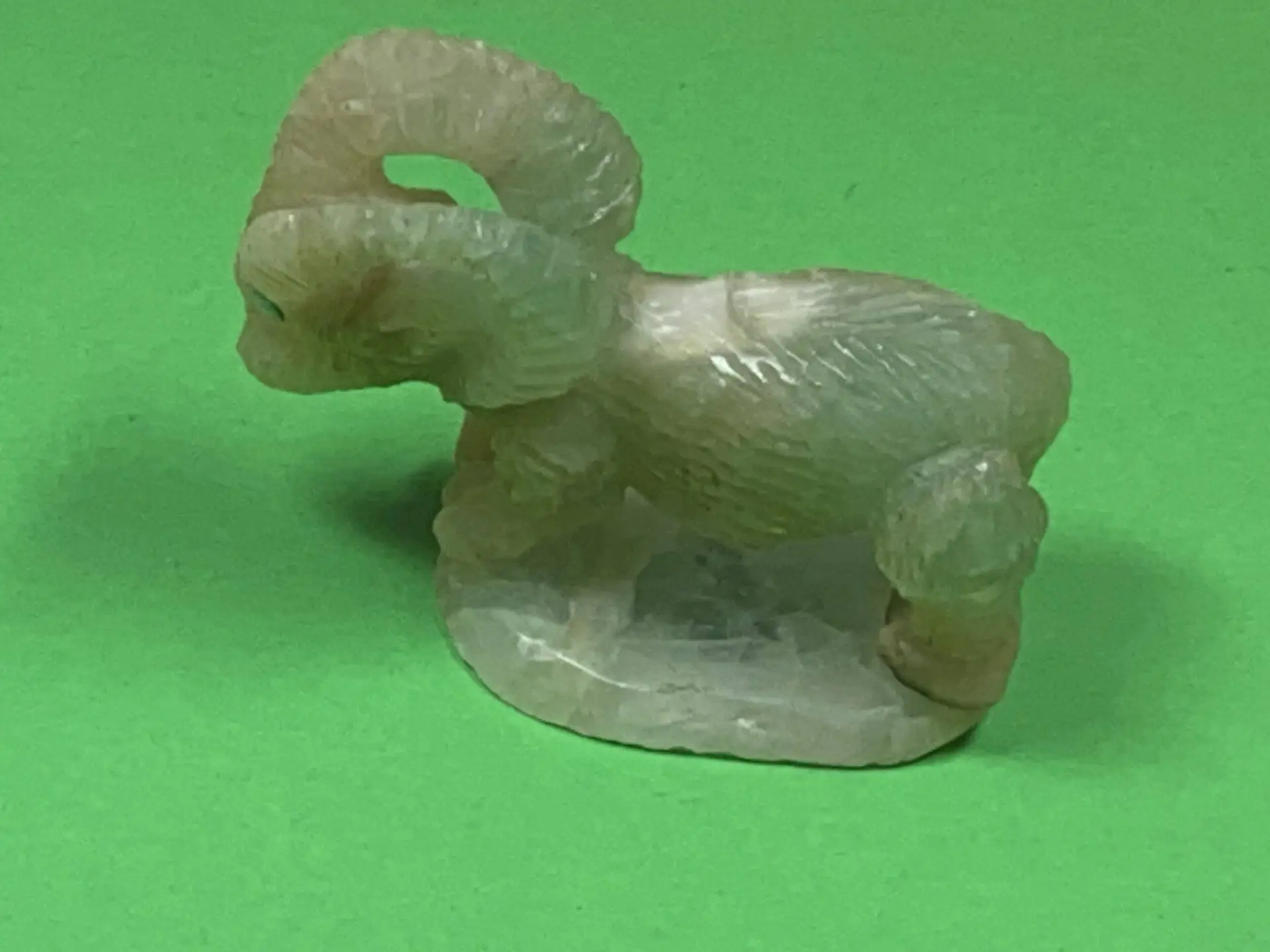 Ein majestätisches Bighorn-Schaf, kunstvoll aus dem schillernden Material der Fluorit-Gesteine gefertigt, fasziniert mit seiner lebendigen Ausstrahlung und seiner Detailgenauigkeit. Dieses beeindruckende Zuni-Steintier verkörpert die Essenz der natürlichen Welt und vereint die meisterhafte Handwerkskunst mit der Schönheit der Mineralwelt.
