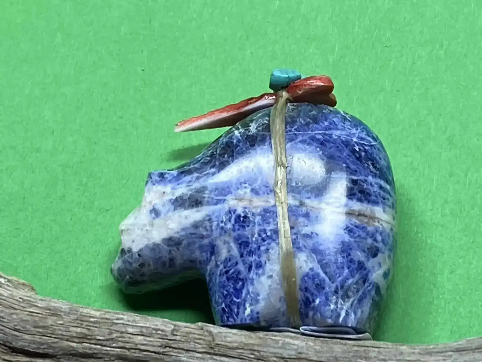 Bär aus Sodalite mit Bündel aus Spiny Oyster, einer Pfeilspitze und zwei Türkisnuggets