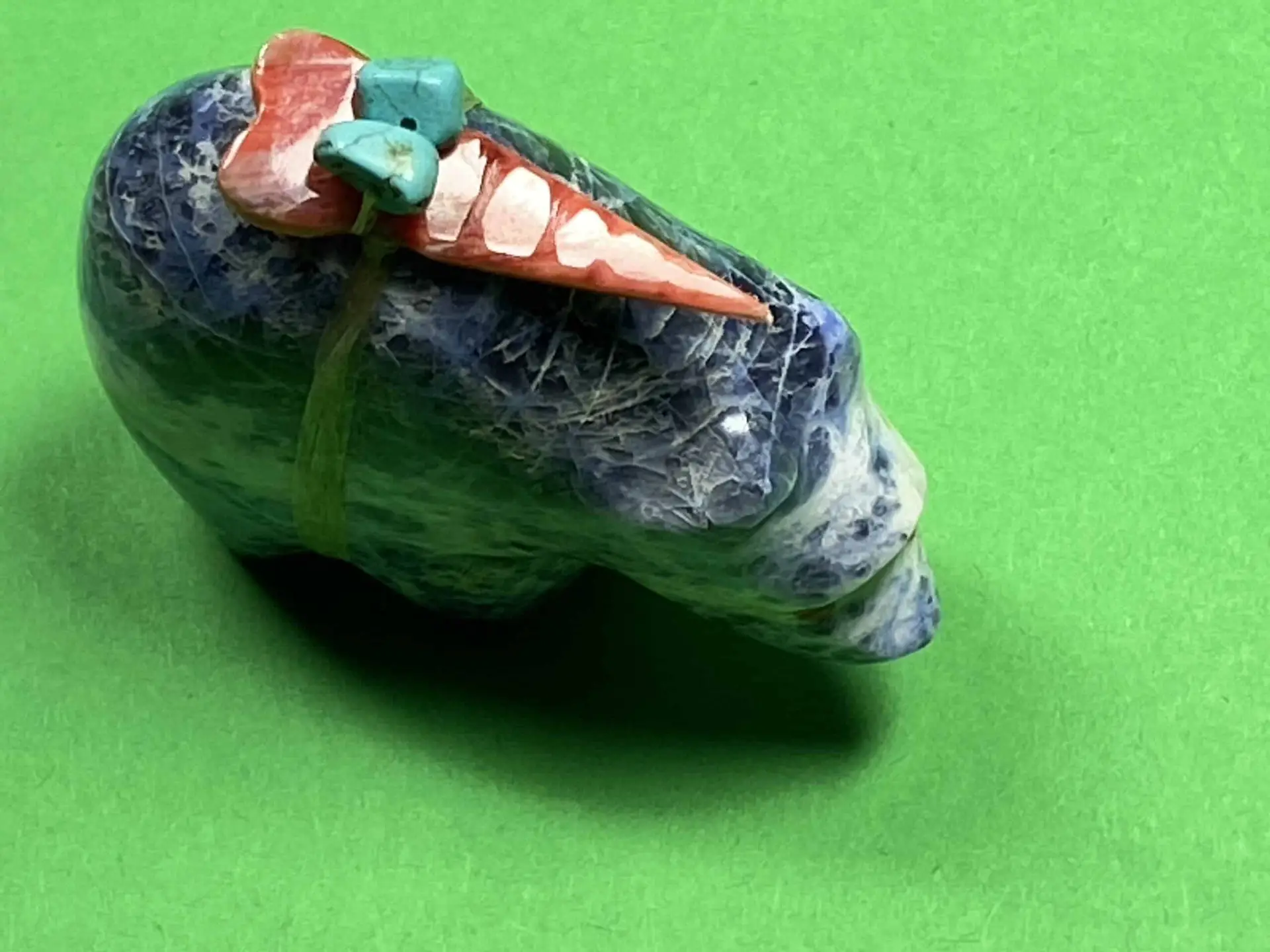 Dieser kunstvoll geschnitzte Bär von Leland Boone besteht aus Sodalit und trägt ein Bündel, das eine Pfeilspitze aus Spiny Oyster sowie zwei Türkisnuggets umfasst.