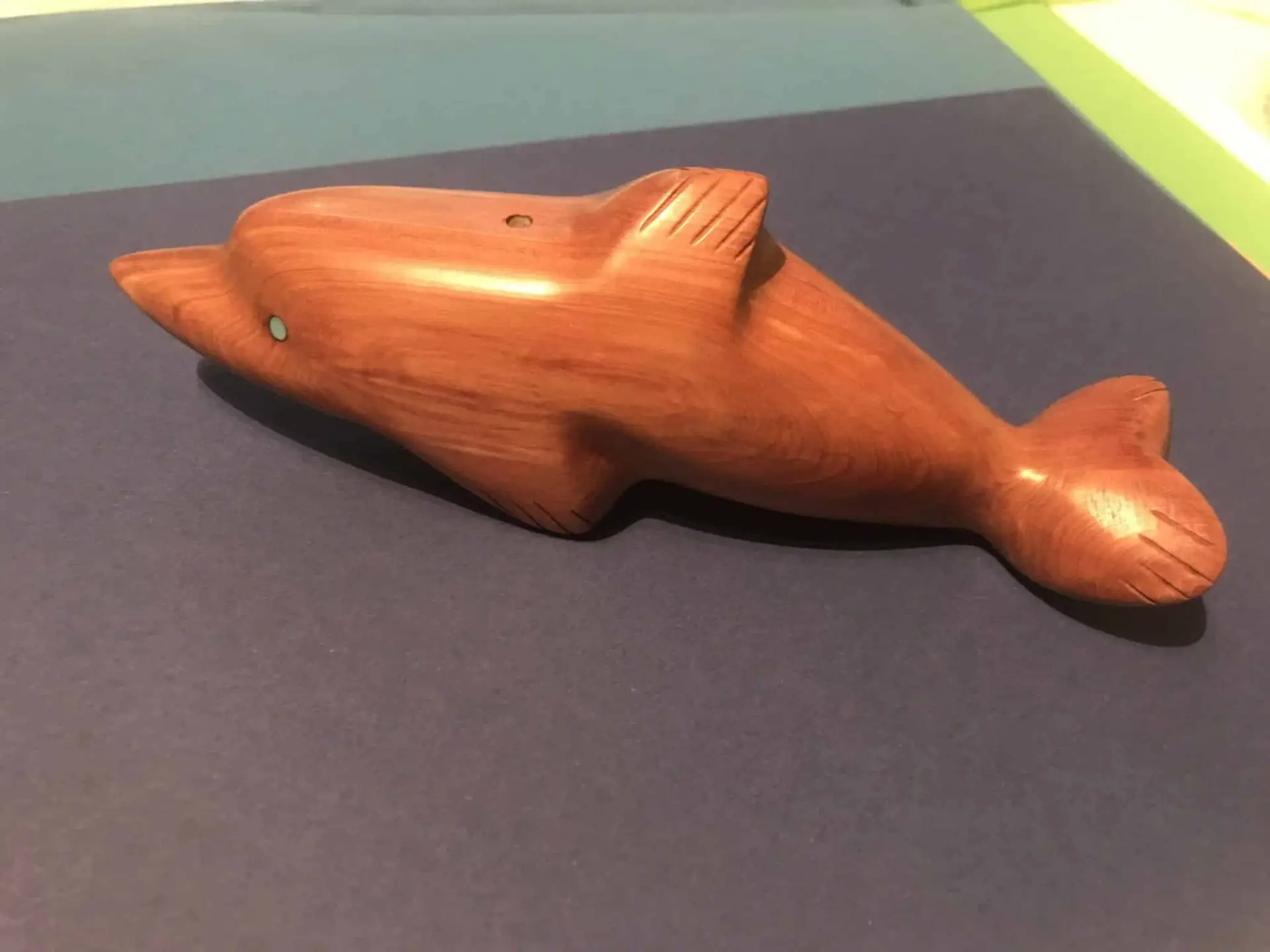 Dieser aus Zedernholz geschnitzte Delphin von Herb Halate, einem Künstler der Zuni, vereint die elegante Form des Meeresbewohners mit der warmen Ausstrahlung des Holzes. In der Zuni-Kultur symbolisieren Delphine Intelligenz, Verspieltheit und die Verbindung zum Wasser, das als lebensspendendes Element gilt. Das Zedernholz, das für Reinheit und spirituelle Klarheit steht, verstärkt die sanfte und beruhigende Energie dieses Tieres.