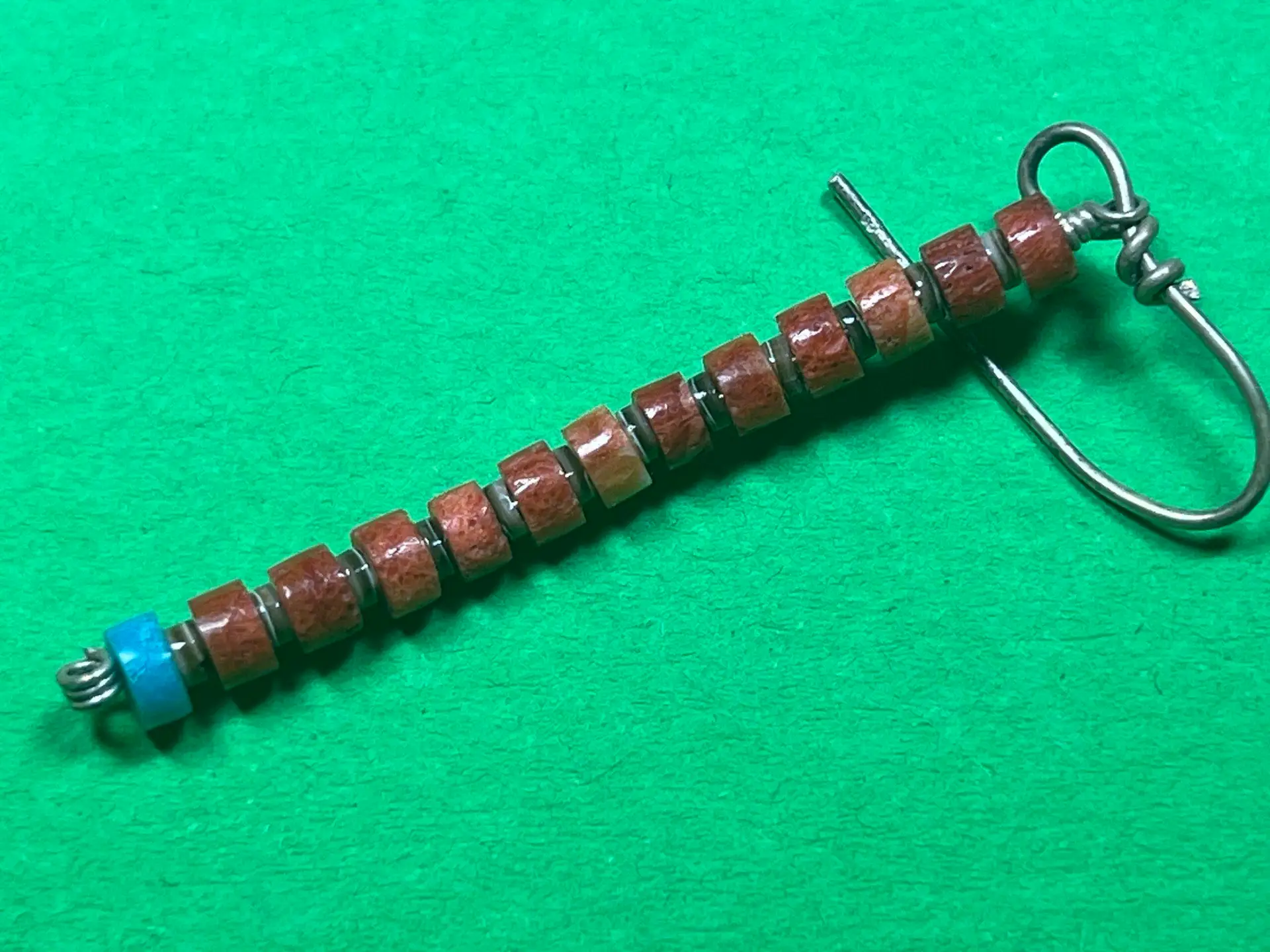 Zwischen den Apple-Coral-Perlen sind vereinzelt hellere Einlagen sichtbar, vermutlich kleine Muschelscheiben. Diese setzen dezente farbliche Akzente und verleihen den Hängern eine rhythmische Gliederung. Den unteren Abschluss bildet jeweils eine flach geschliffene Türkisperle Raymond Gasper Zuni 8211 Muschelkette Mit Guide sichtbarer Maserung, gefasst durch ein kleines, rundes Metallelement. Die Kombination von Apple Coral und Türkis ist charakteristisch für traditionellen Schmuck aus dem Südwesten der USA.