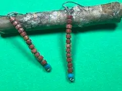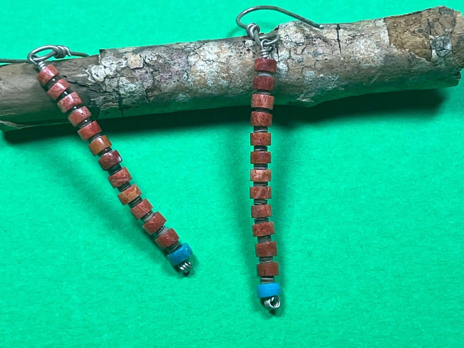 Dieses Paar langer Ohrhänger wurde von Lenore Cheykaychi gefertigt, einer Künstlerin mit familiären Wurzeln bei den Kewa (Santo Domingo Pueblo) und Hopi. Die Ohrhänger bestehen aus jeweils einer senkrechten Reihe rotbrauner Scheibenperlen aus Apple Coral. Die Perlen sind regelmäßig geschliffen und leicht glänzend. Ihre warmrote Farbe zeigt natürliche Variationen, die für diesen Werkstoff typisch sind.