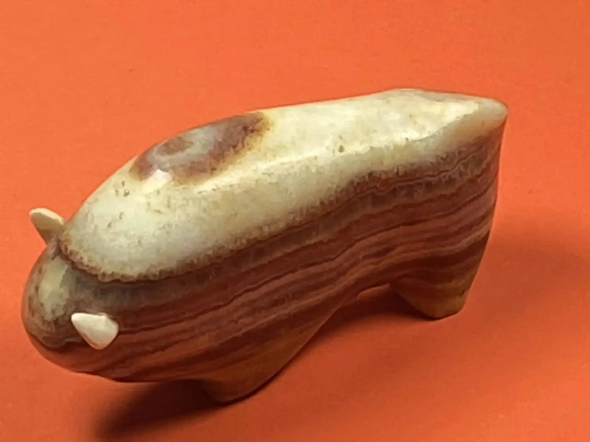 Büffel aus mexikanischem Onyx mit Türkisinlay für die Augen und Hörner aus Muschel