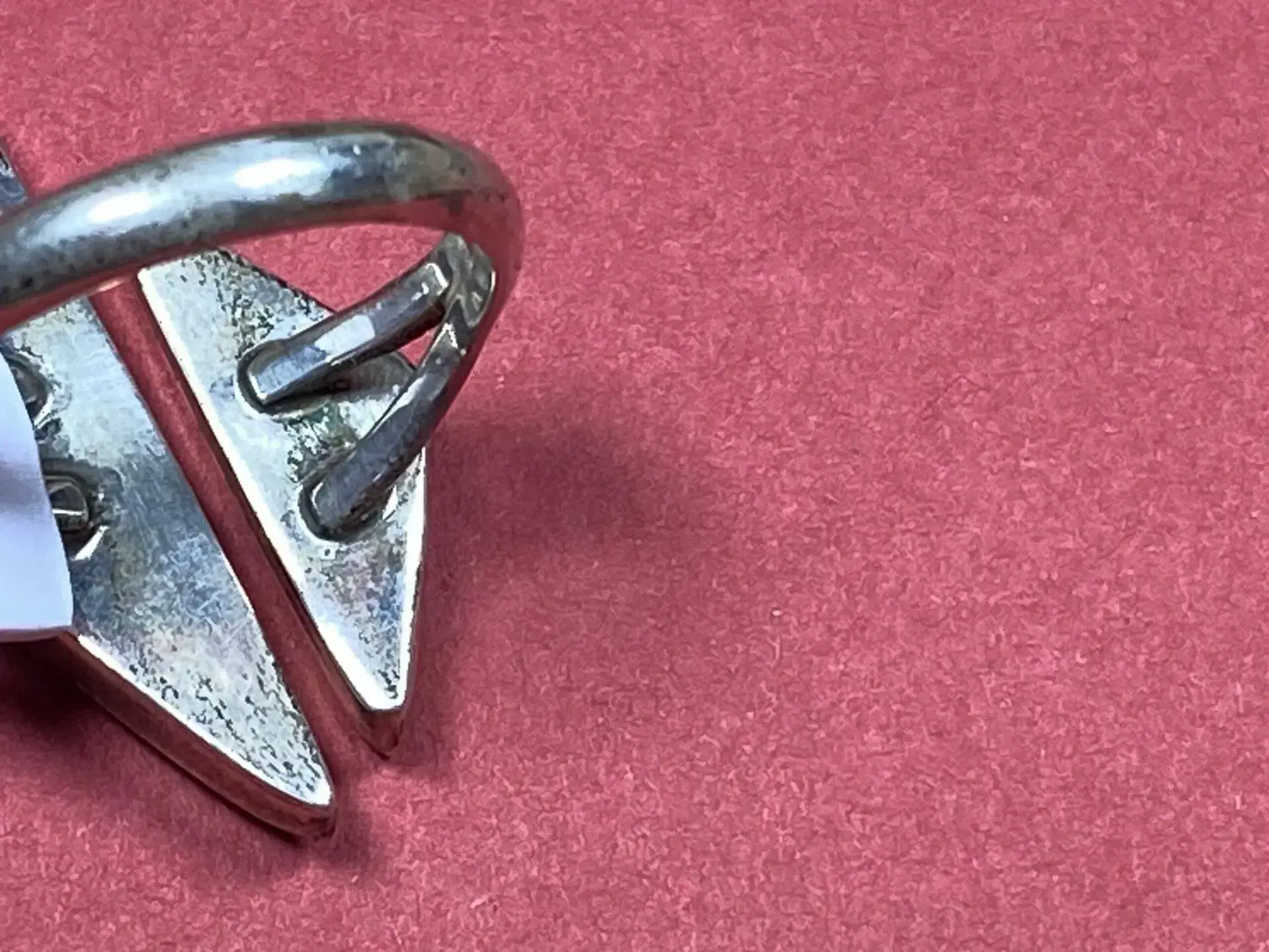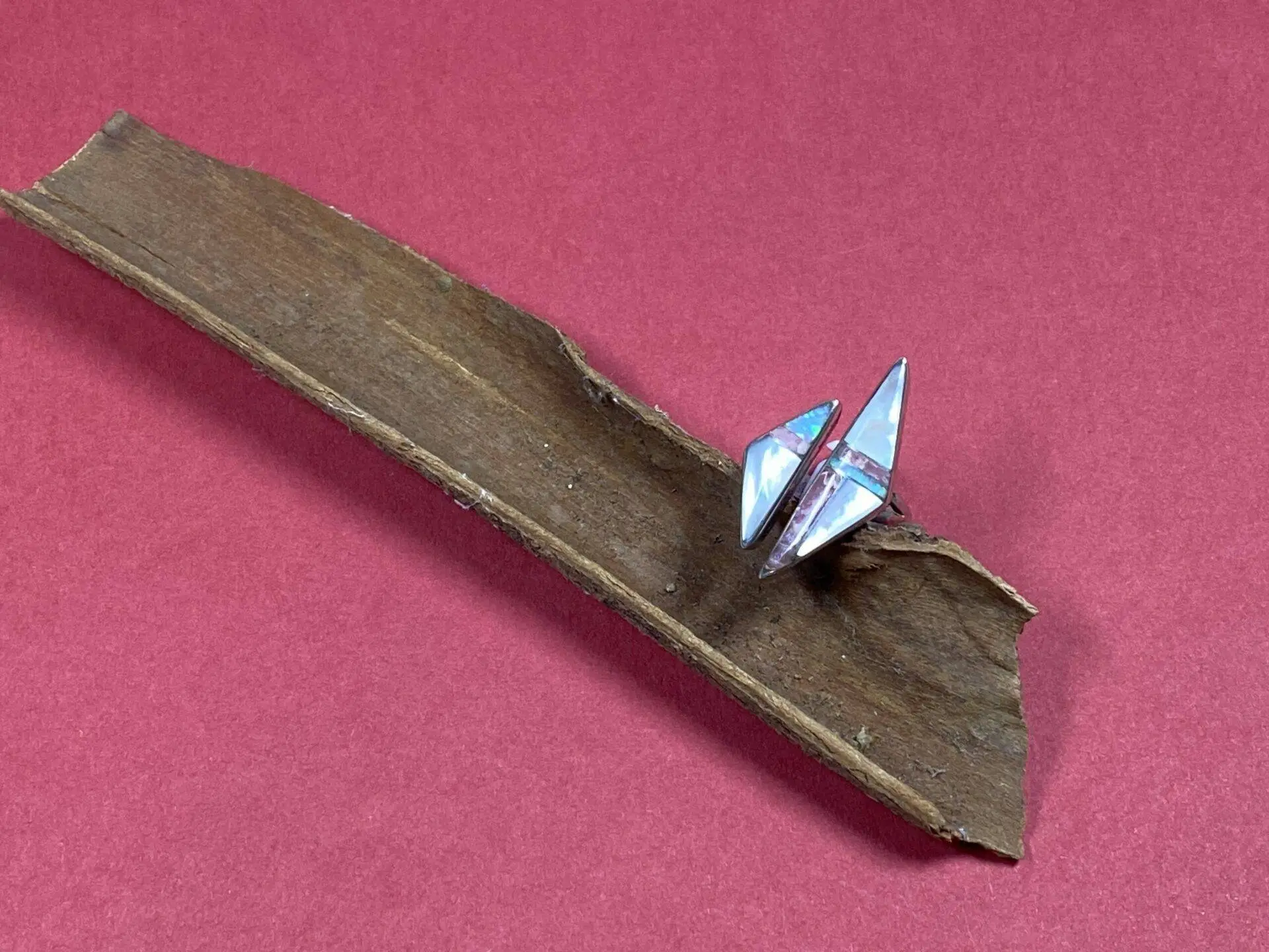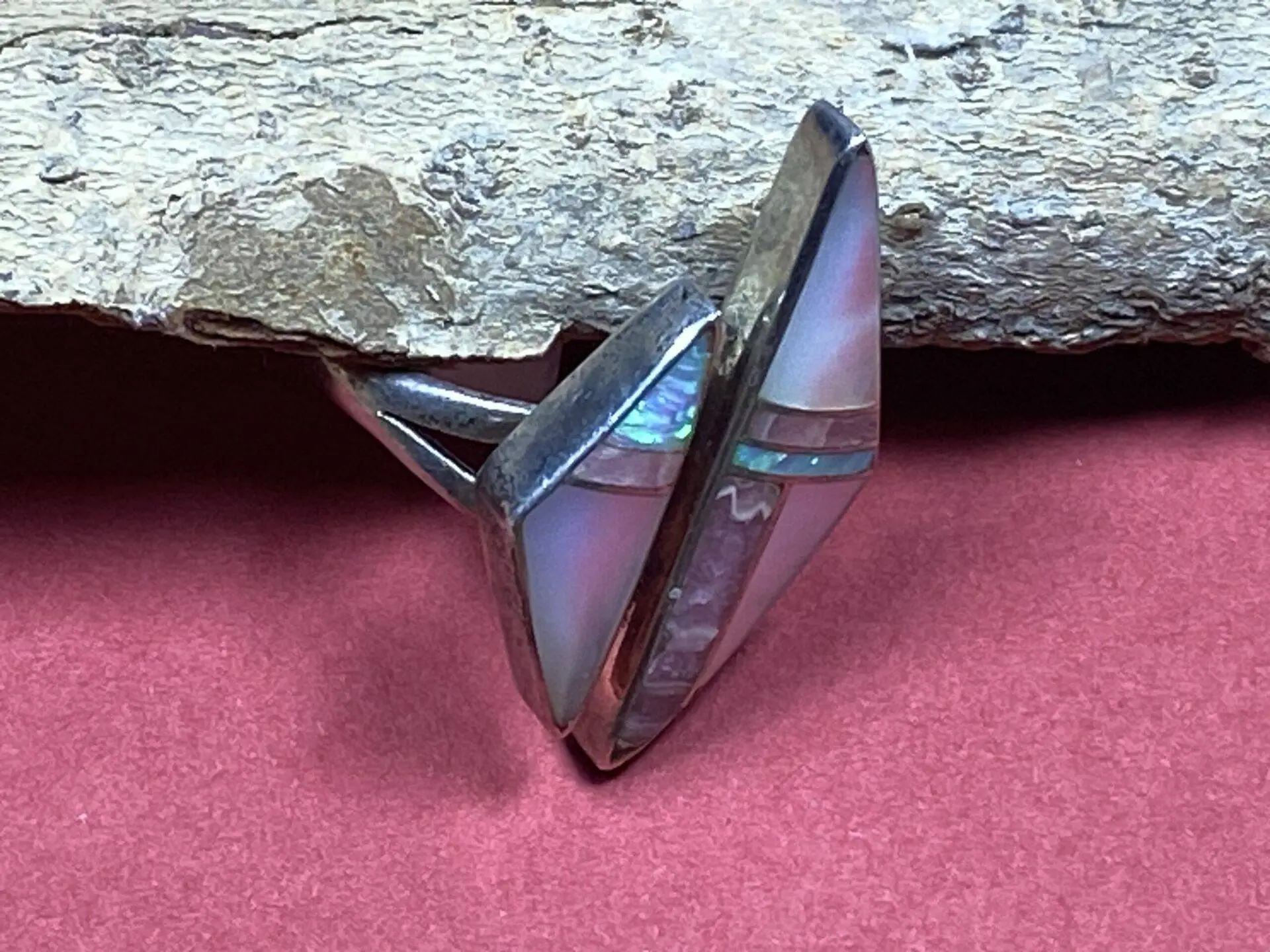 Dieser außergewöhnliche Fingerring von Mary Tsosie, einer bekannten Künstlerin der Navajo, ist aus feinstem Sterlingsilber gefertigt und besticht durch zwei unterschiedlich große Dreiecke, die kunstvoll mit Perlmutt, Jaspis und Opal verziert sind. Der Ring hat eine Größe von 7 und einen Innendurchmesser von 1,8 cm, was ihn zu einem auffälligen und stilvollen Accessoire macht.