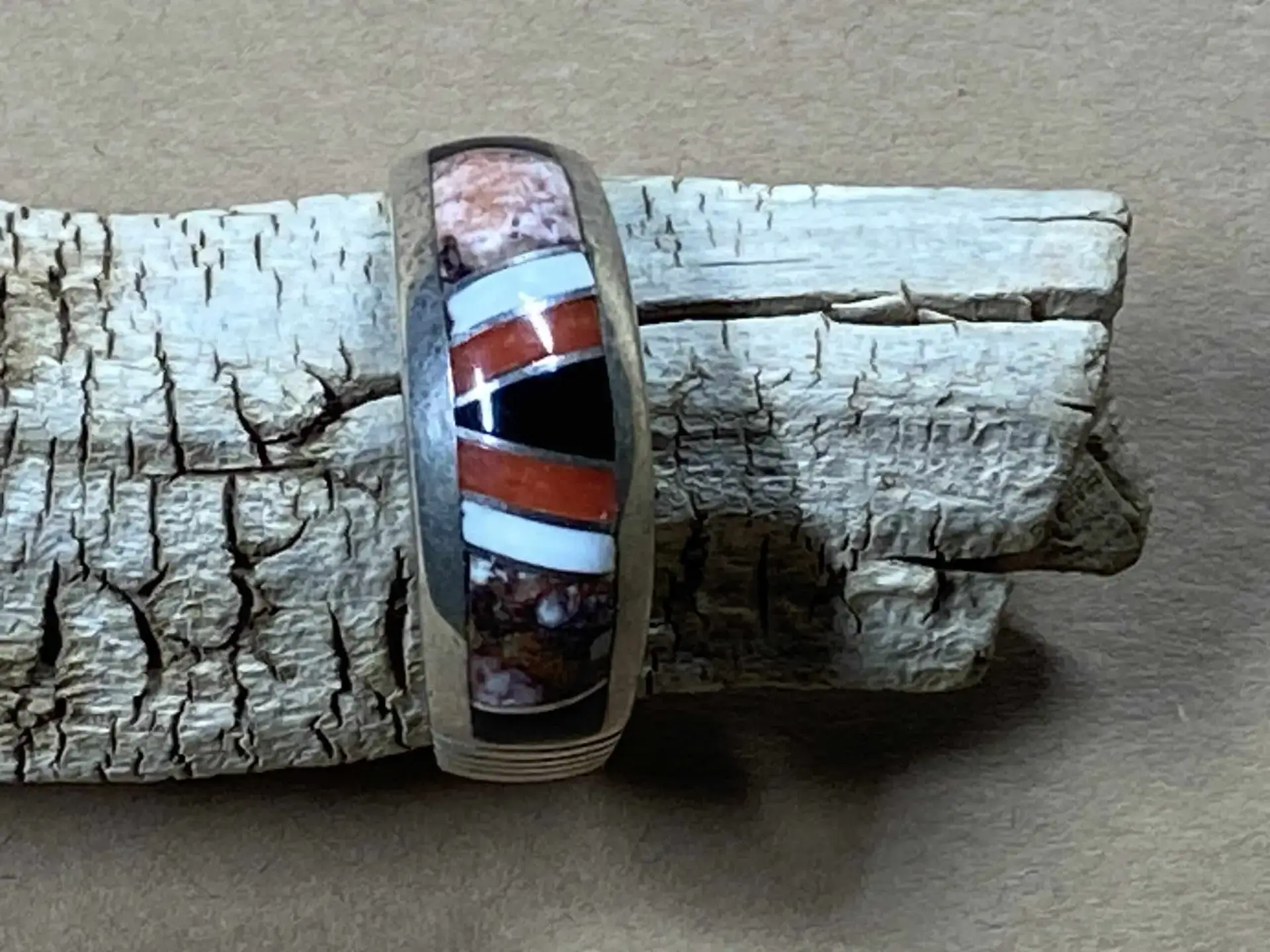 Fingerring aus Sterlingsilber mit Mosaic Inlay aus Jet, Rhodonite, Muschel, Koralle und Wild Horse Türkis