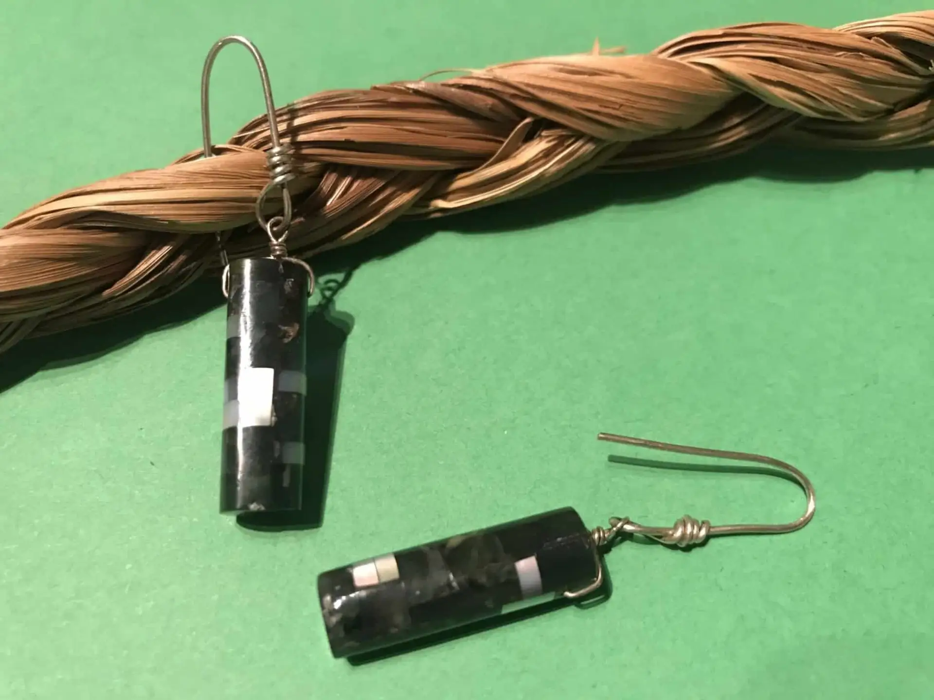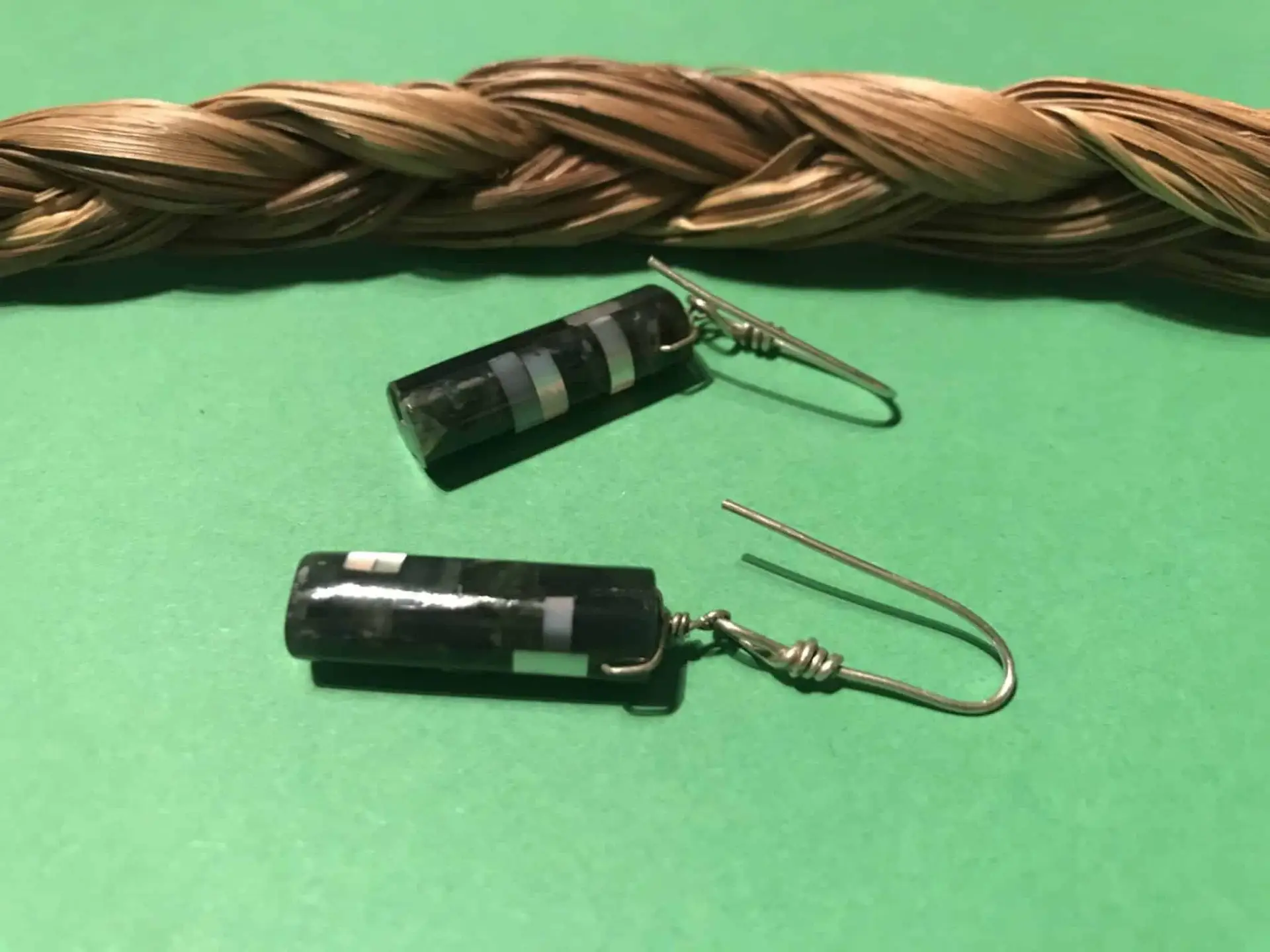 Ohrhänger in Form eines Mosaic Inlay-Fässchen mit Jade und Perlmutt; handgefertigte Bügel aus Sterlingsilber