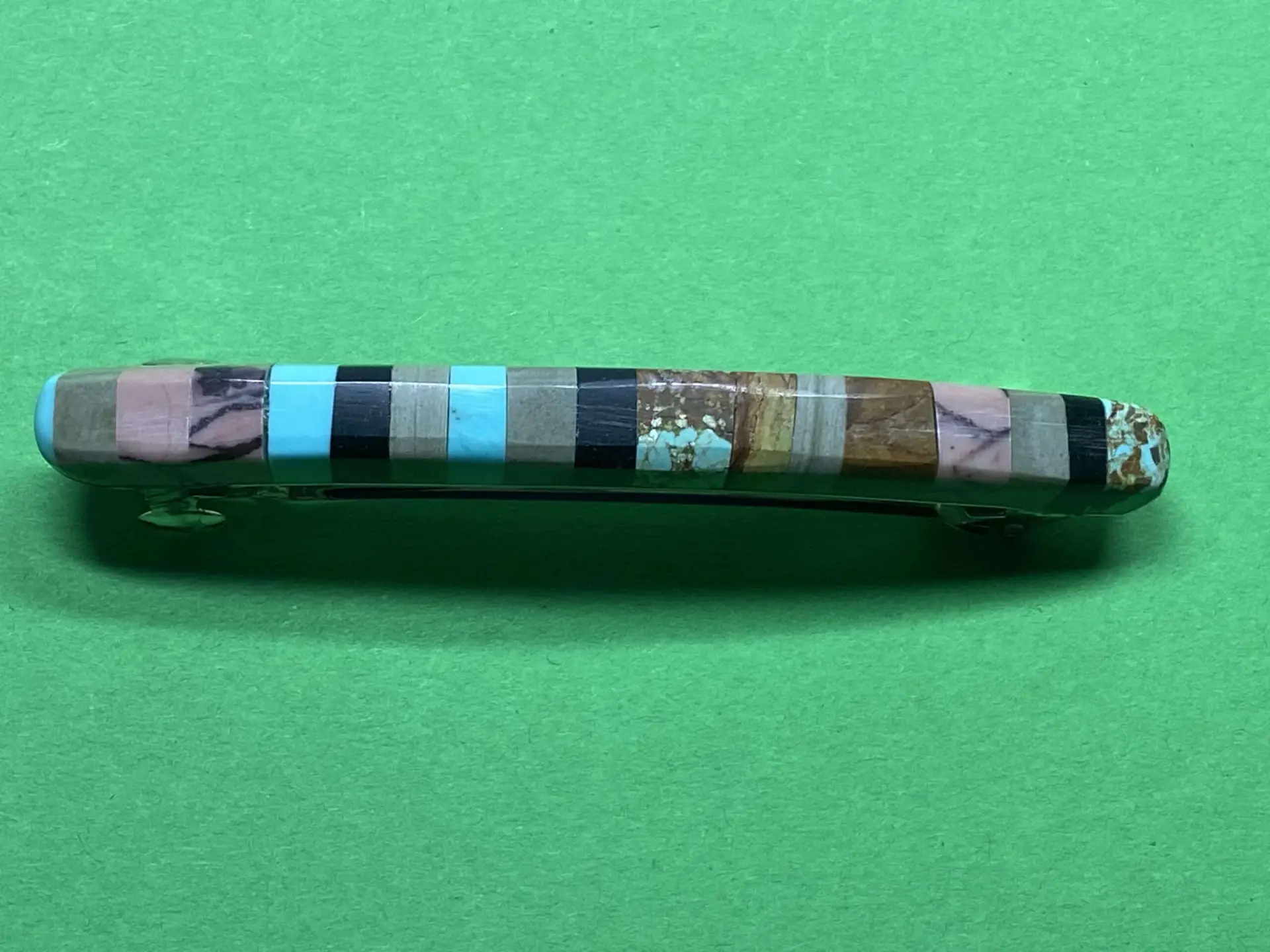Haarschmuck aus Messingspange mit einem Mosaik aus Türkis, Serpentin, Jet und Rhodonit