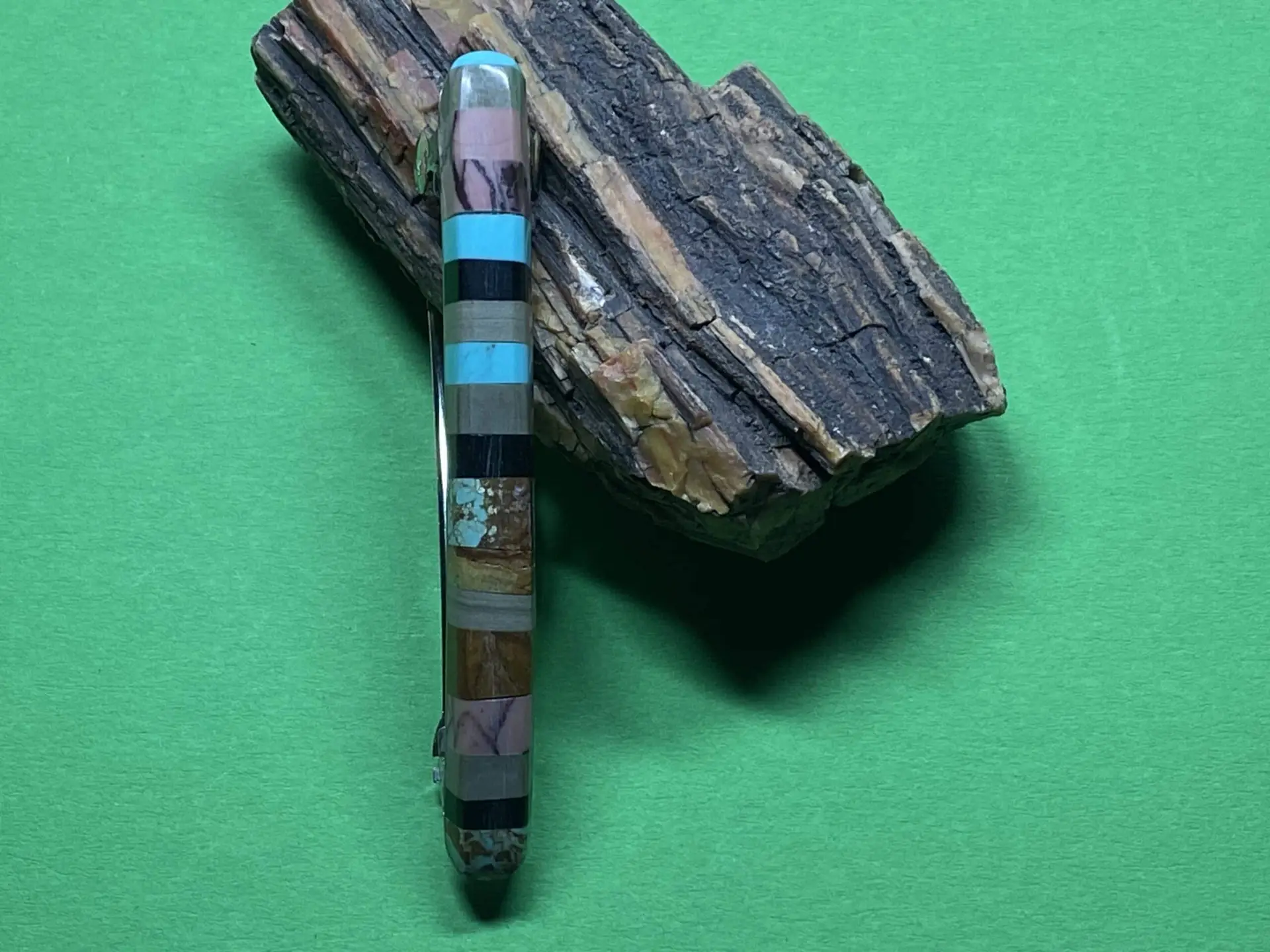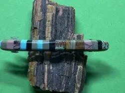 Was diesen Haarschmuck jedoch wirklich zu einem Meisterwerk macht, ist das darauf angebrachte Mosaik. Ein komplexes Zusammenspiel von Paul Coriz (Kewa) – Kleine Inlay-Klammer, Serpentin, Jet (versteinerte Kohle) und Rhodonit fügt sich zu einem harmonischen und doch lebendigen Design zusammen. Der Augustine Lovato Kewa 8211 3reihige Halskette bringt leuchtende Blau- und Grüntöne ein, während der Serpentin mit seinem oft marmorierten Aussehen Tiefe verleiht. Der Jet, mit seiner tiefen, glänzenden Schwarzfarbe, bietet einen kräftigen Kontrast, und der Rhodonit, bekannt für seine rosenroten und oft pinkfarbenen Töne, setzt warme Akzente.