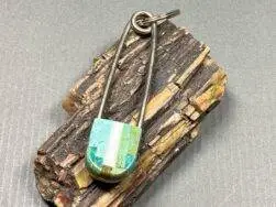 Klammer / Nadel aus Metall und Mosaic Inlay aus Türkis, Perlmutt und Serpentin. Als Schlüsselanhänger oder zum Zusammenhalten von Jacken geeignet