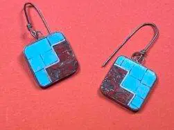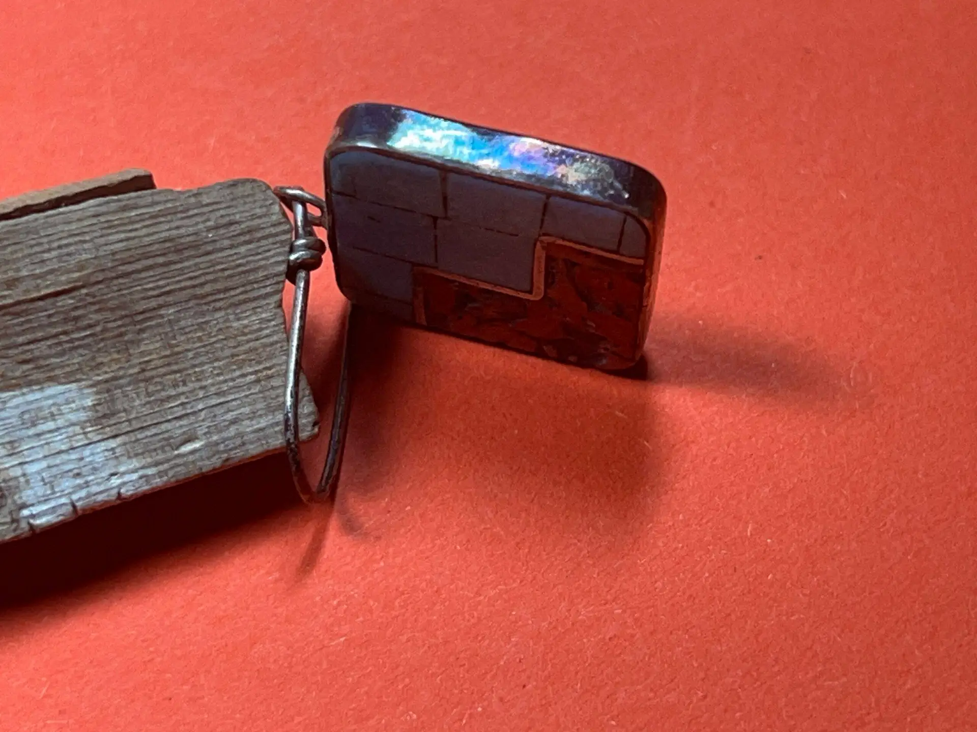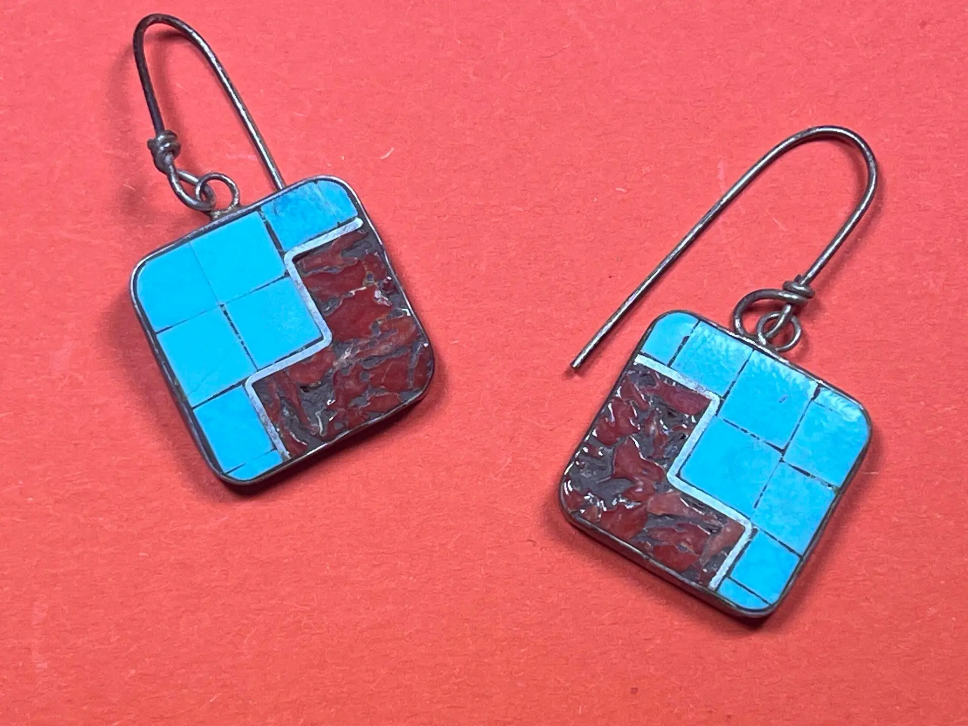 Paar viereckiger Ohrhänger mit abgerundeten Ecken gefertigt von Priscilla Aguilar (Kewa). Die Stücke bestehen aus einem Trägerelement aus Serpentin, auf dem ein Inlay aus Türkis und roter Koralle präzise eingefasst ist. Das Inlay ist von einem schmalen Rahmen aus Sterlingsilber umgeben, der die quadratische Form zusätzlich betont.