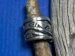 Das Design dieses Rings zeigt Wassersymbole, die in der Hopi-Kultur als Sinnbild für Leben, Erneuerung und Verbindung zwischen den Welten gelten. Die Linien sind schwungvoll, zugleich streng gegliedert und rhythmisch angeordnet. Die dunklen Flächen zwischen den polierten Erhebungen lassen die Bewegung des Wassers beinahe spürbar werden.
