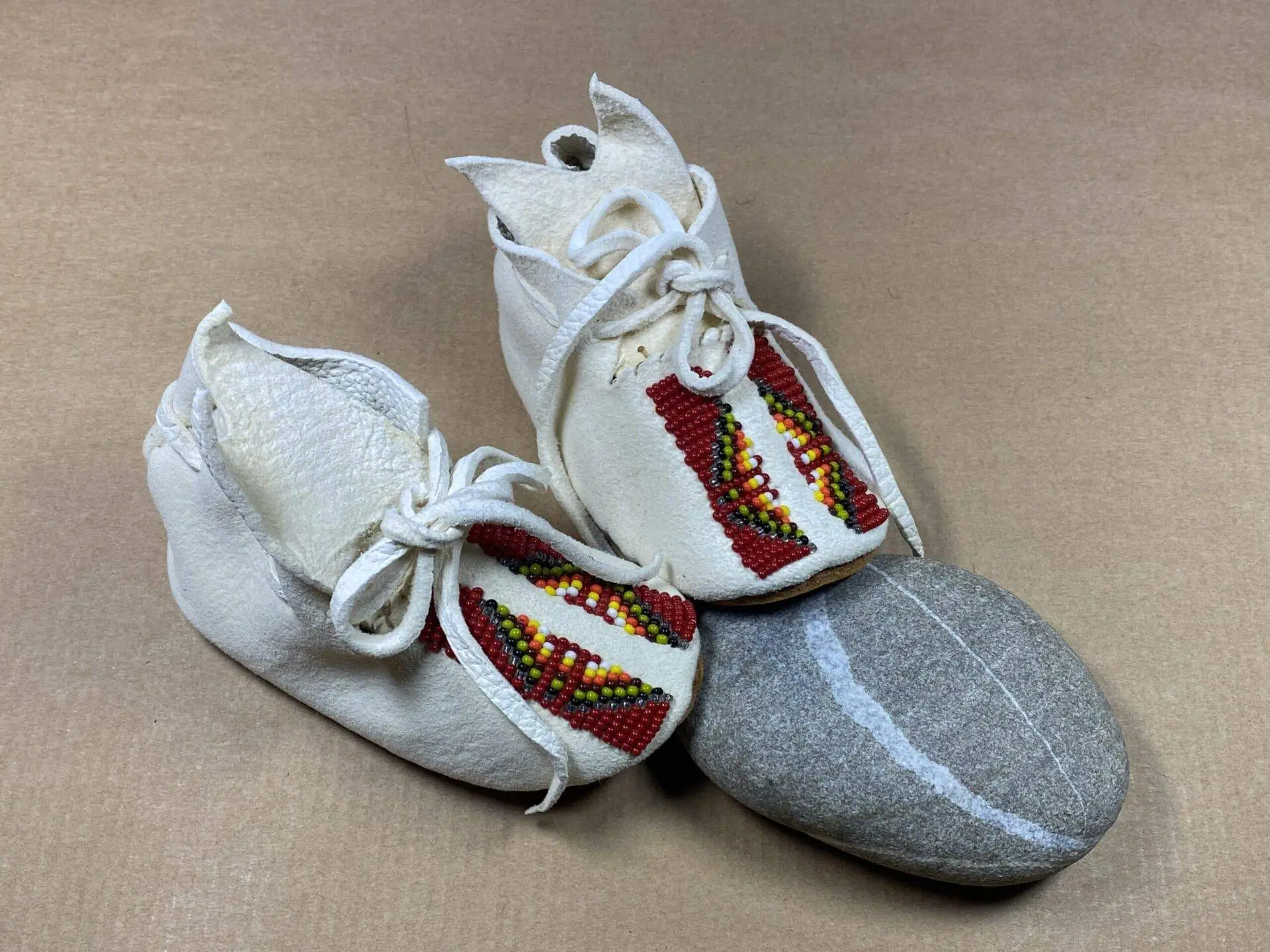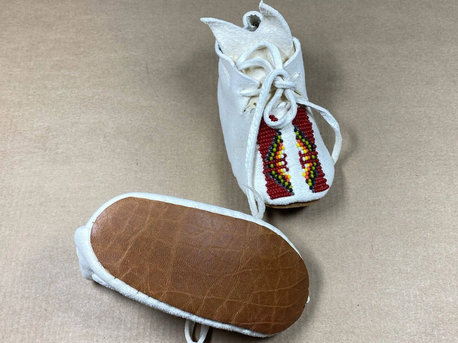Die aufgenähten festen Ledersohlen bieten nicht nur Schutz und Halt, sondern symbolisieren auch die Stärke und das Erbe, das von einer Generation zur nächsten weitergegeben wird. Diese Babymokassins tragen die Essenz der Taos Pueblo-Kultur und erzählen von einer tiefen Verbindung zur Vergangenheit und zur Zukunft.