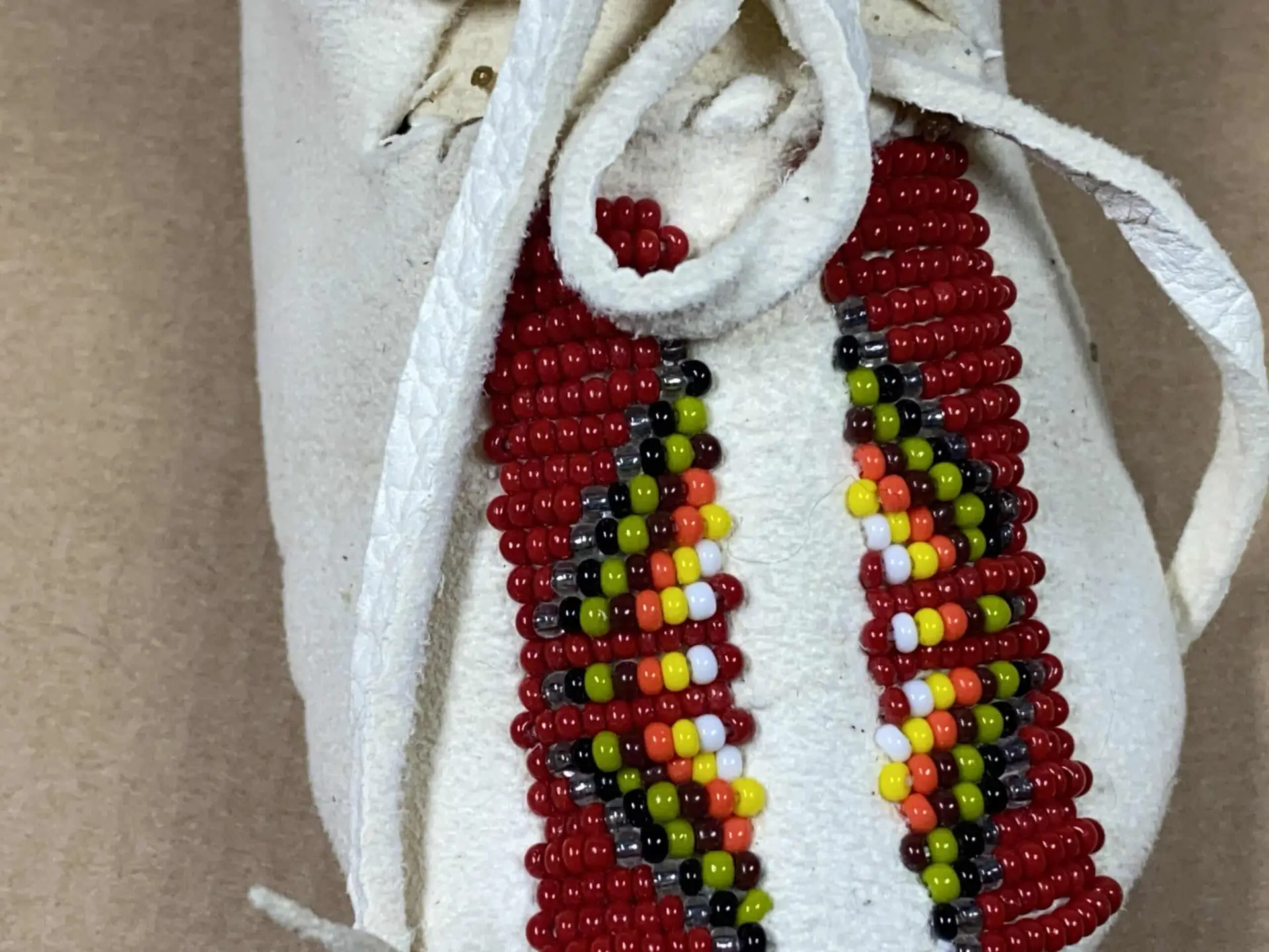 Hergestellt aus weißem Rehleder, umhüllen diese Babymokassins die Füße eines Kindes mit sanfter Eleganz. Die Verwendung von Rehleder verleiht nicht nur Weichheit und Anmut, sondern ist auch eine Hommage an die enge Verbindung zwischen den Taos Pueblo-Gemeinschaften und der Natur. Die Glasperlenstickerei, liebevoll als Douglas Fast Horse (Oglala Lakota) – Tasche bekannt, schmückt die Oberfläche der Mokassins mit faszinierenden Mustern und Farben. Jeder Perlenstich ist eine sorgfältige Geste des Künstlers, der seine kulturellen Wurzeln ehrt.