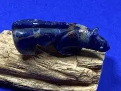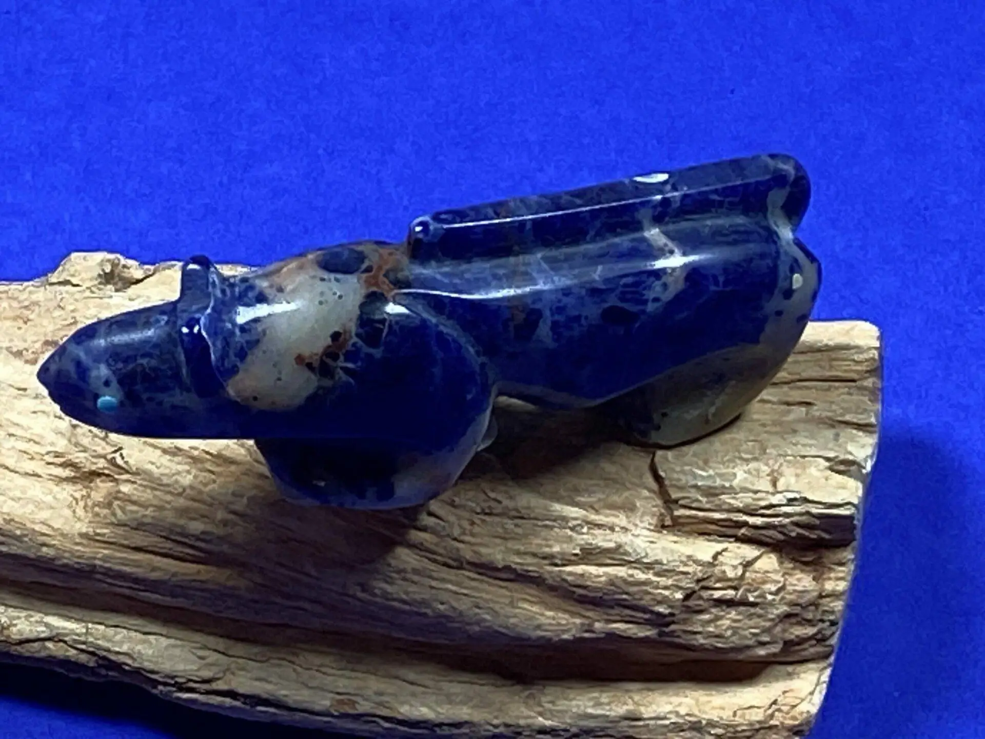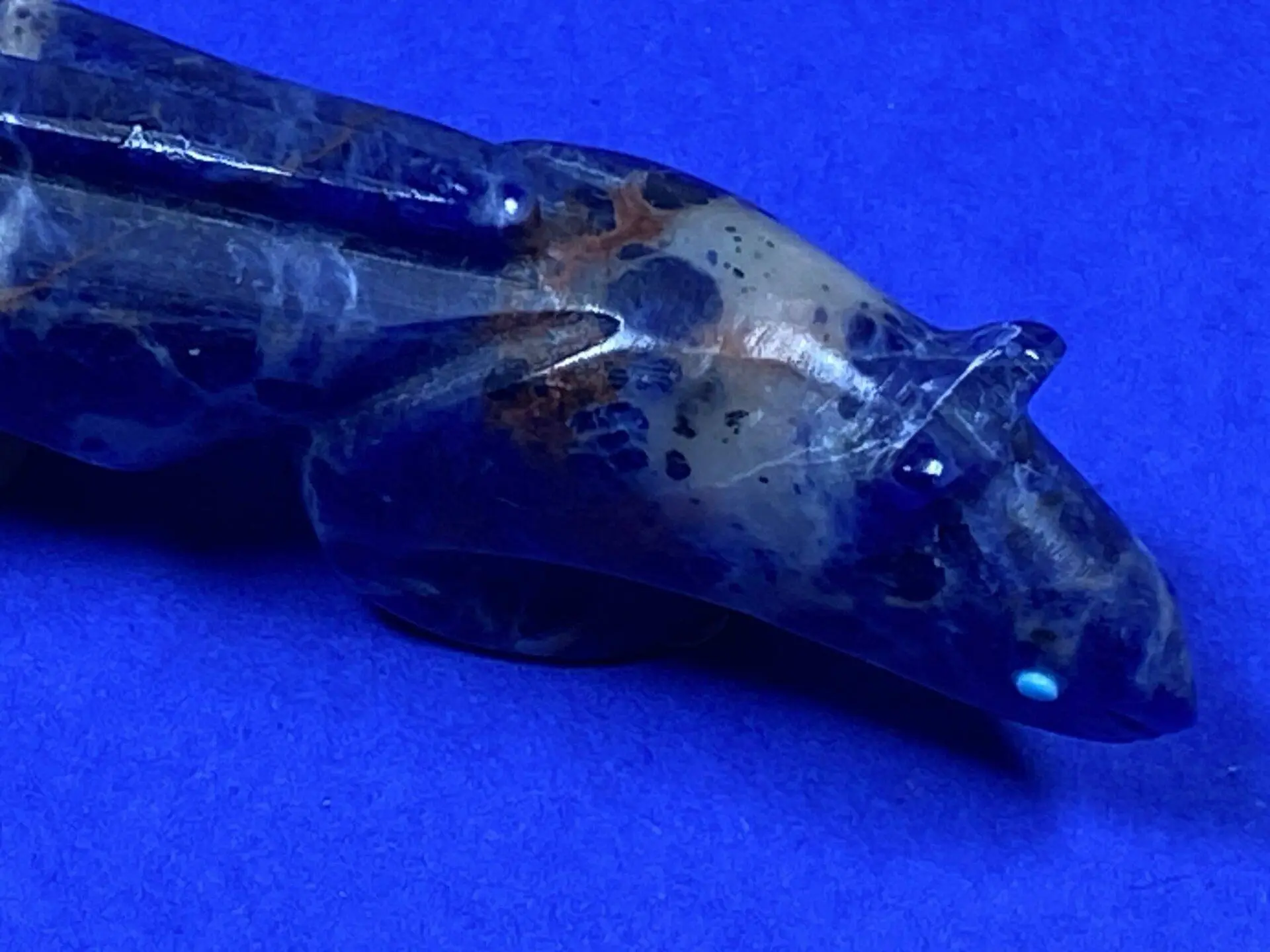 Dieser leicht gebogene Berglöwe von Ronnie Lunasee ist aus Sodalith geschnitzt und misst 6,8 cm in der Länge.